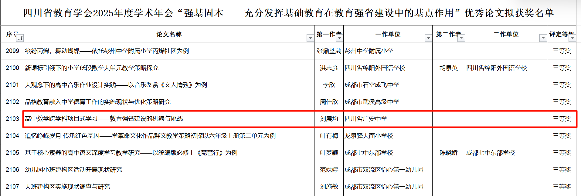 刘展均的论文《高中数学跨学科项目式学习——教育强省建设的机遇与挑战》在四川省教育学会举办的“2025年度学术年会主题优秀论文征集评选活动”中荣获省三等奖。此次评选活动共收到7012篇申报论文,经过资格审查、专家评审和评委会审定,最终评选出3936篇拟获奖论文,其中一等奖347篇、二等奖1303篇、三等奖2286篇。该论文针对教育强省建设中的基础教育基点作用进行了深入探讨。