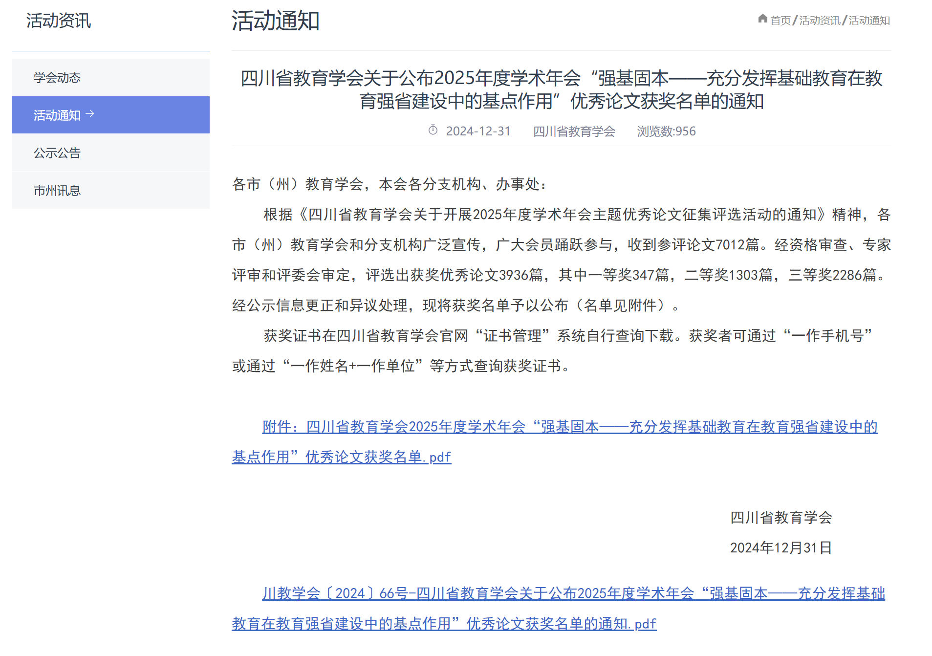 四川省教育学会关于公布2025年度学术年会“强基固本——充分发挥基础教育在教育强省建设中的基点作用”优秀论文获奖名单的通知