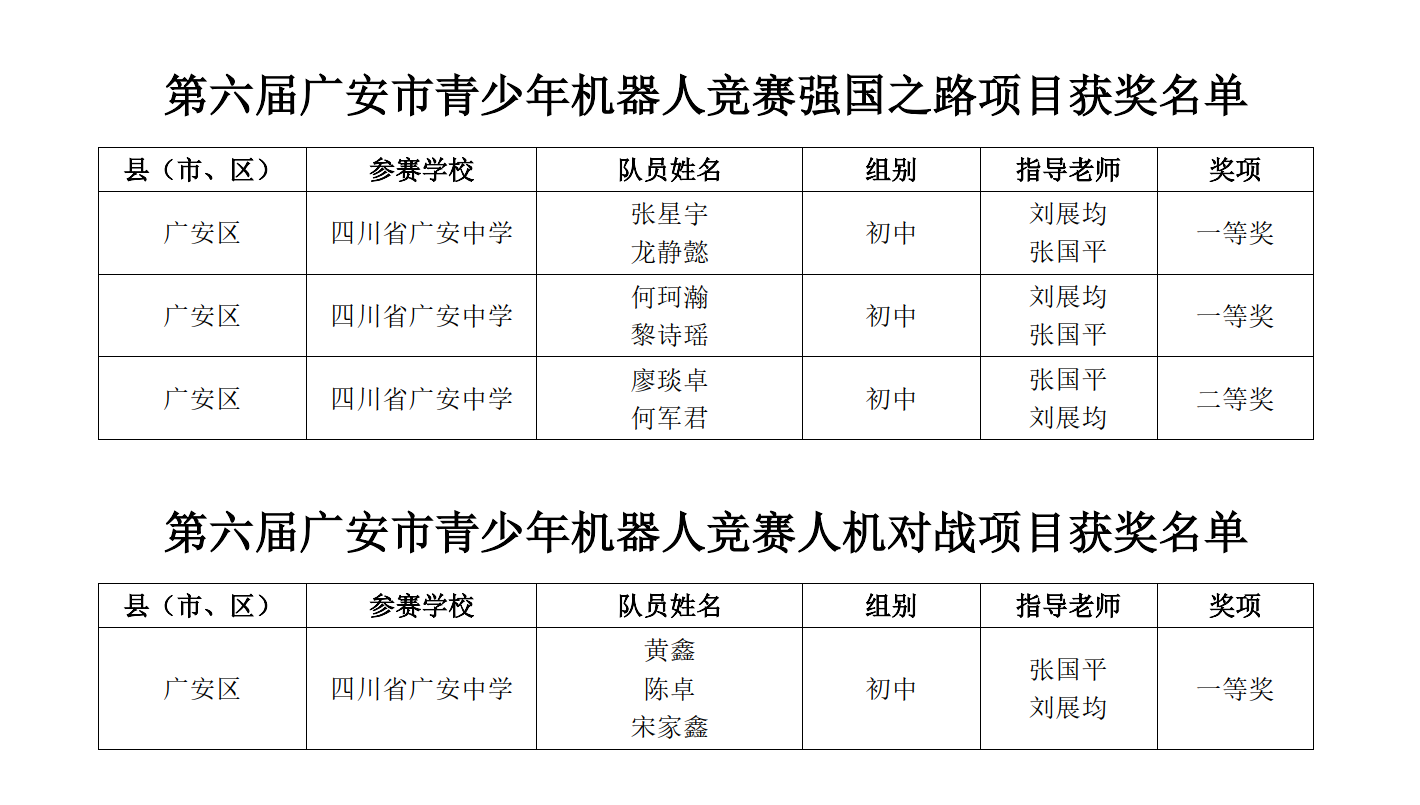 日前,第六届广安市青少年机器人竞赛结果出炉,我作为指导教师的几只战队取得了不错的成绩。首先要祝贺张星宇、龙静懿,何珂瀚、黎诗瑶,他们在“强国之路”项目中获得了一等奖!廖琰卓和何军君同学也表现出色,荣获了该项目的二等奖。特别值得一提的是,这是我们学校第一次参加“强国之路”项目,就能取得这样的成绩,实属不易,这也离不开同学们的辛勤付出和刻苦钻研。同时,也要祝贺黄鑫、陈卓和宋家鑫同学,他们在“人机对抗”项目中获得了一等奖!黄鑫和陈卓两位同学之前还有过省赛的参赛经验,这次比赛他们也发挥了重要的作用,带领队伍取得了优异的成绩。