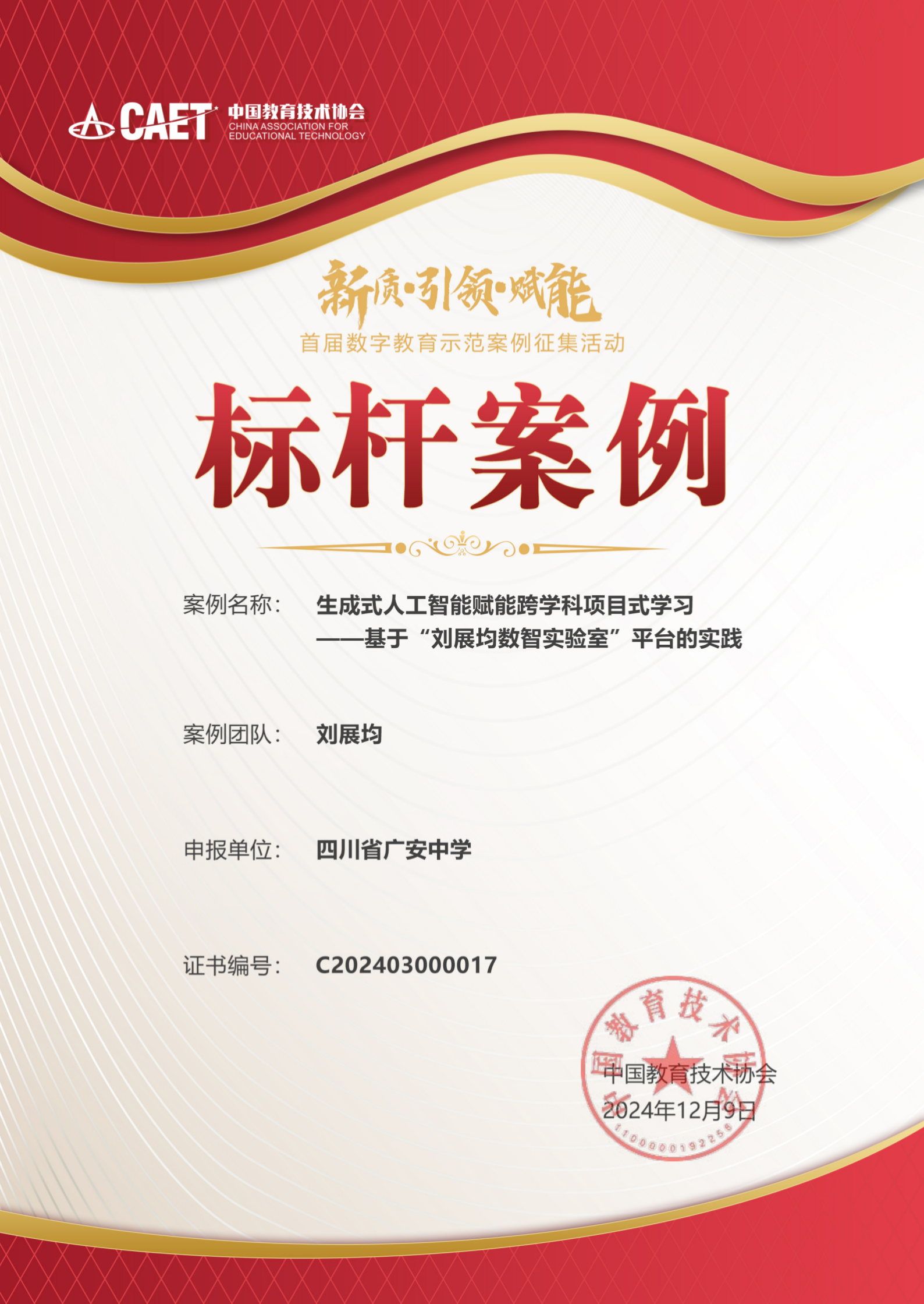 刘展均主持的案例《生成式人工智能赋能跨学科项目式学习——基于“刘展均数智实验室”平台的实践》成功入围基础教育全国标杆案例(基础教育仅20个)。