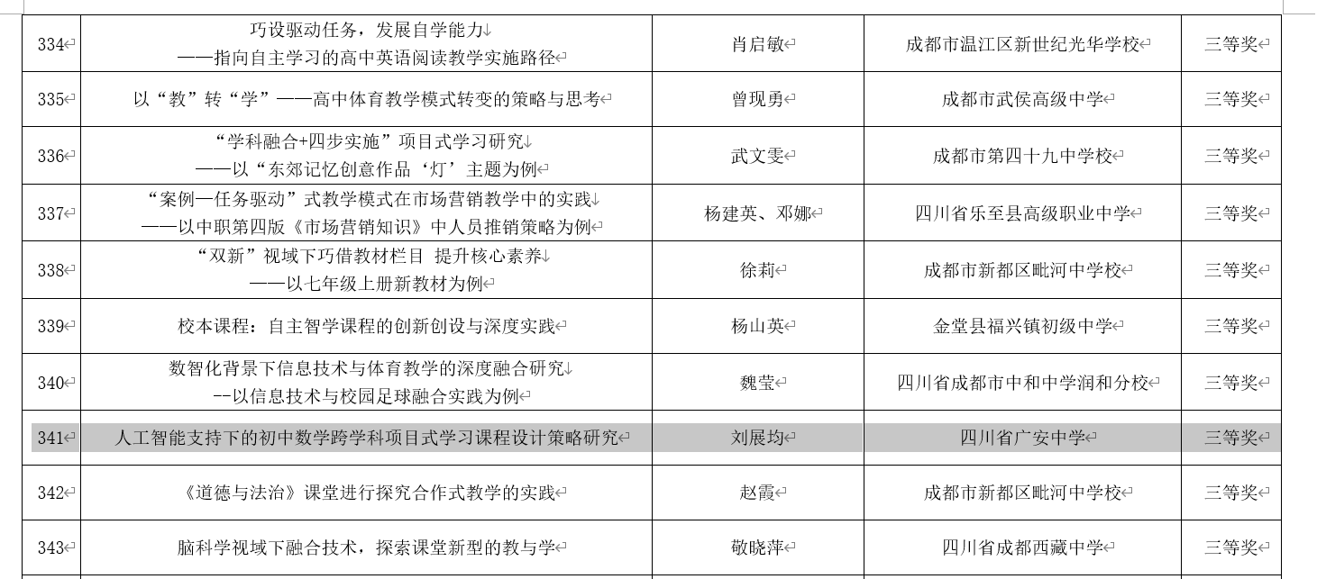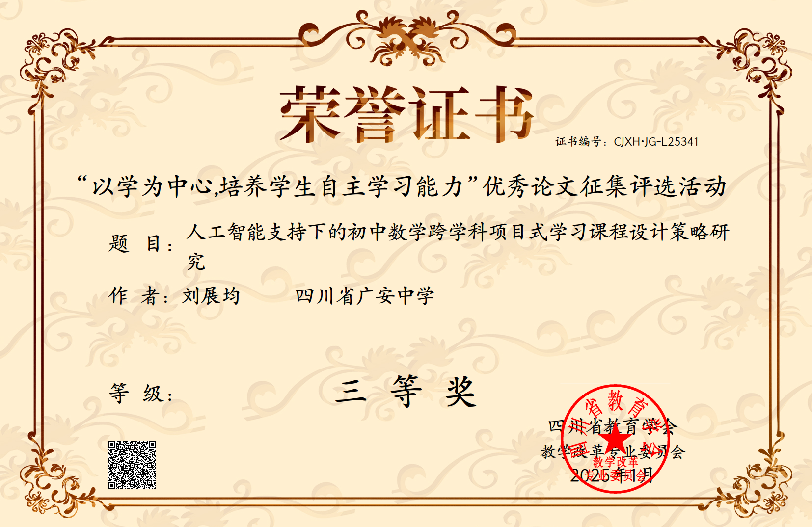 刘展均的论文《人工智能支持下的初中数学跨学科项目式学习课程设计策略研究》在四川省教育学会教学改革专业委员会举办的“以学为中心,培养学生自主学习能力”优秀论文征集评选活动中荣获省三等奖。此次活动共收到1179篇参评文章,经过资格审查和专家评审,最终评选出685篇获奖论文,其中刘展均的论文位列其中,彰显了其在教育改革领域的研究成果。