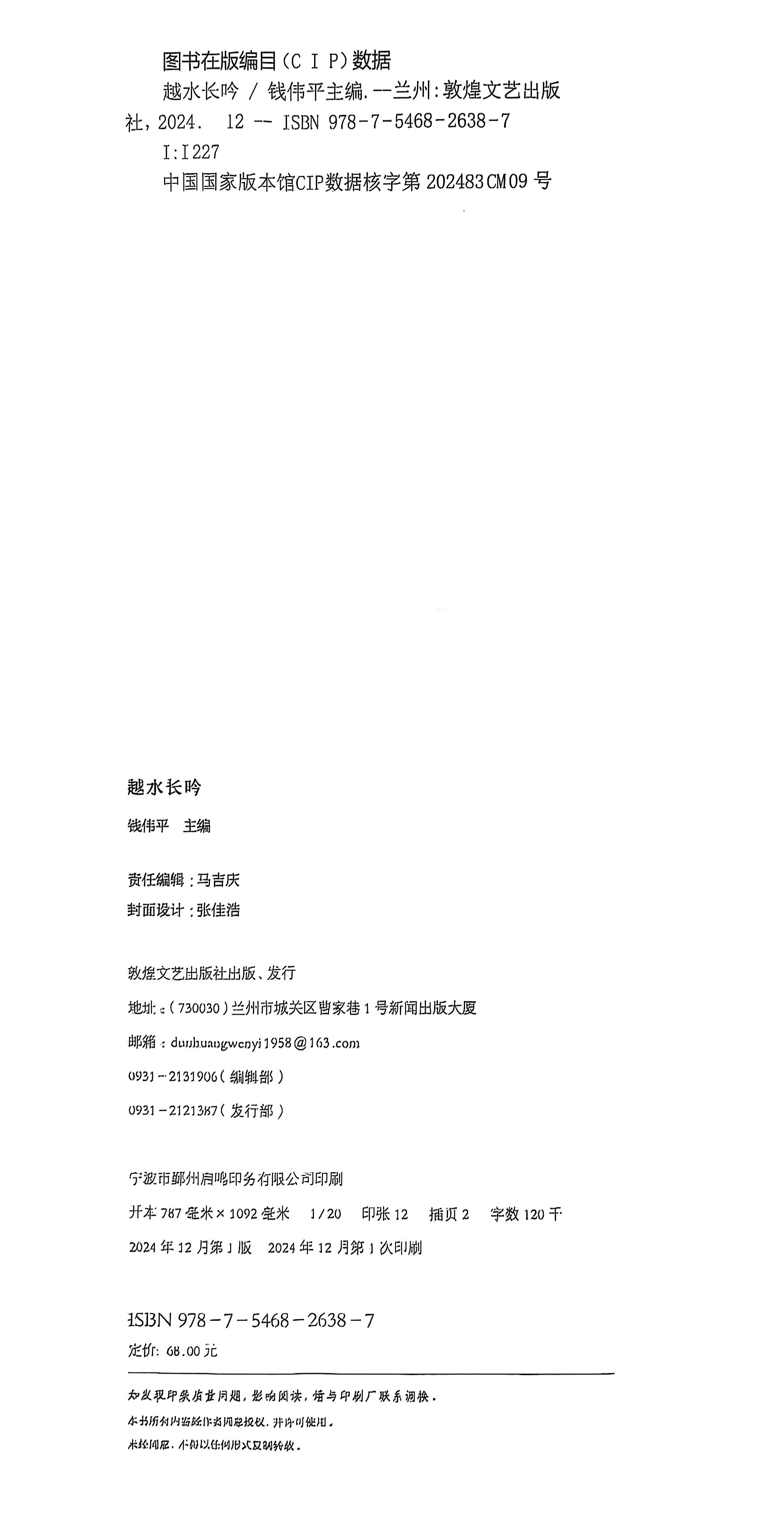 [1] 钱伟平. 越水长吟[M]. 兰州: 敦煌文艺出版社, 2024.12, ISBN:978-7-5468-2638-7: 236-237