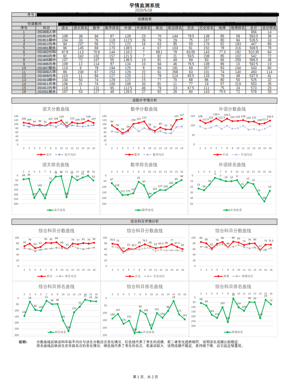 同学A:分数曲线变化与均分线变化大体一致且都在均分线上方,说明成绩较为稳定,再根据排名曲线情况可以发现从第10次考试开始,年级排名在稳步上升,这是非常好的现象;