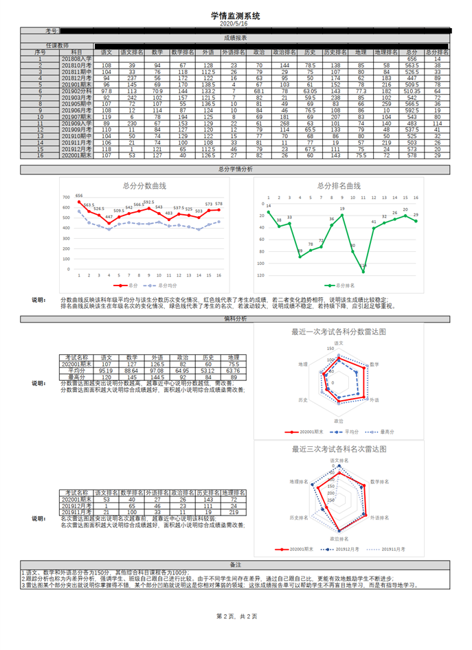 整个系统使用Excel开发,仅使用了Excel内置函数和宏命令,可以比较方便进行维护,终于历经多个版本修改之后,达到目前比较满意的效果。由于面向对象为学生,因此在设计时只采用了均分、折线图和雷达图这三项可视化程度较好,便于学生理解的指标图式,学生可以根据近期学习安排和时间分配做出针对性调整。