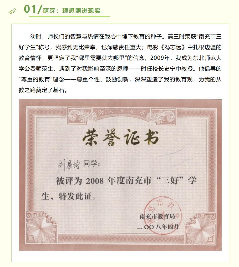 幼时,师长们的智慧与热情在我心中埋下教育的种子。高三时荣获“南充市三好学生”称号,我感到无比荣幸,也深感责任重大;电影《冯志远》中扎根边疆的教育情怀,更坚定了我“哪里需要就去哪里”的信念。2009年,我成为东北师范大学公费师范生,遇到了对我影响至深的恩师——时任校长史宁中教授。他倡导的“尊重的教育”理念——尊重个性、鼓励创新,深深塑造了我的教育观,为我的从教之路奠定了基石。