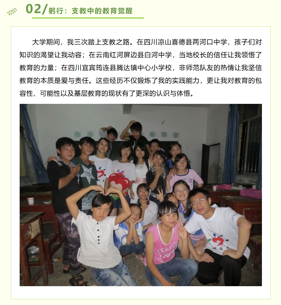 大学期间,我三次踏上支教之路。在四川凉山喜德县两河口中学,孩子们对知识的渴望让我动容;在云南红河屏边县白河中学,当地校长的信任让我领悟了教育的力量;在四川宜宾筠连县腾达镇中心小学校,非师范队友的热情让我坚信教育的本质是爱与责任。这些经历不仅锻炼了我的实践能力,更让我对教育的包容性、可能性以及基层教育的现状有了更深的认识与体悟。