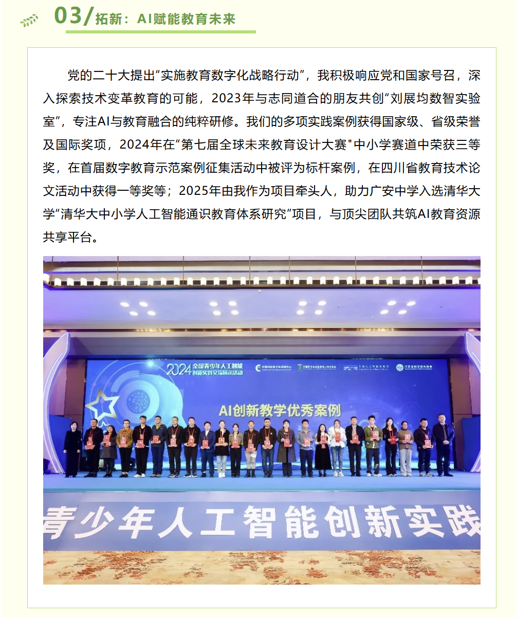 党的二十大提出“实施教育数字化战略行动”,我积极响应党和国家号召,深入探索技术变革教育的可能,2023年与志同道合的朋友共创“刘展均数智实验室”,专注AI与教育融合的纯粹研修。我们的多项实践案例获得国家级、省级荣誉及国际奖项,2024年在“第七届全球未来教育设计大赛"中小学赛道中荣获三等奖,在首届数字教育示范案例征集活动中被评为标杆案例,在四川省教育技术论文活动中获得一等奖等;2025年由我作为项目牵头人,助力广安中学入选清华大学“清华大中小学人工智能通识教育体系研究”项目,与顶尖团队共筑AI教育资源共享平台。