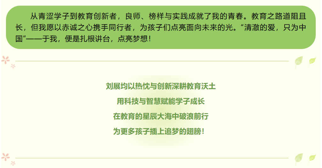 从青涩学子到教育创新者,良师、榜样与实践成就了我的青春。教育之路道阻且长,但我愿以赤诚之心携手同行者,为孩子们点亮面向未来的光。“清澈的爱,只为中国”——于我,便是扎根讲台,点亮梦想!