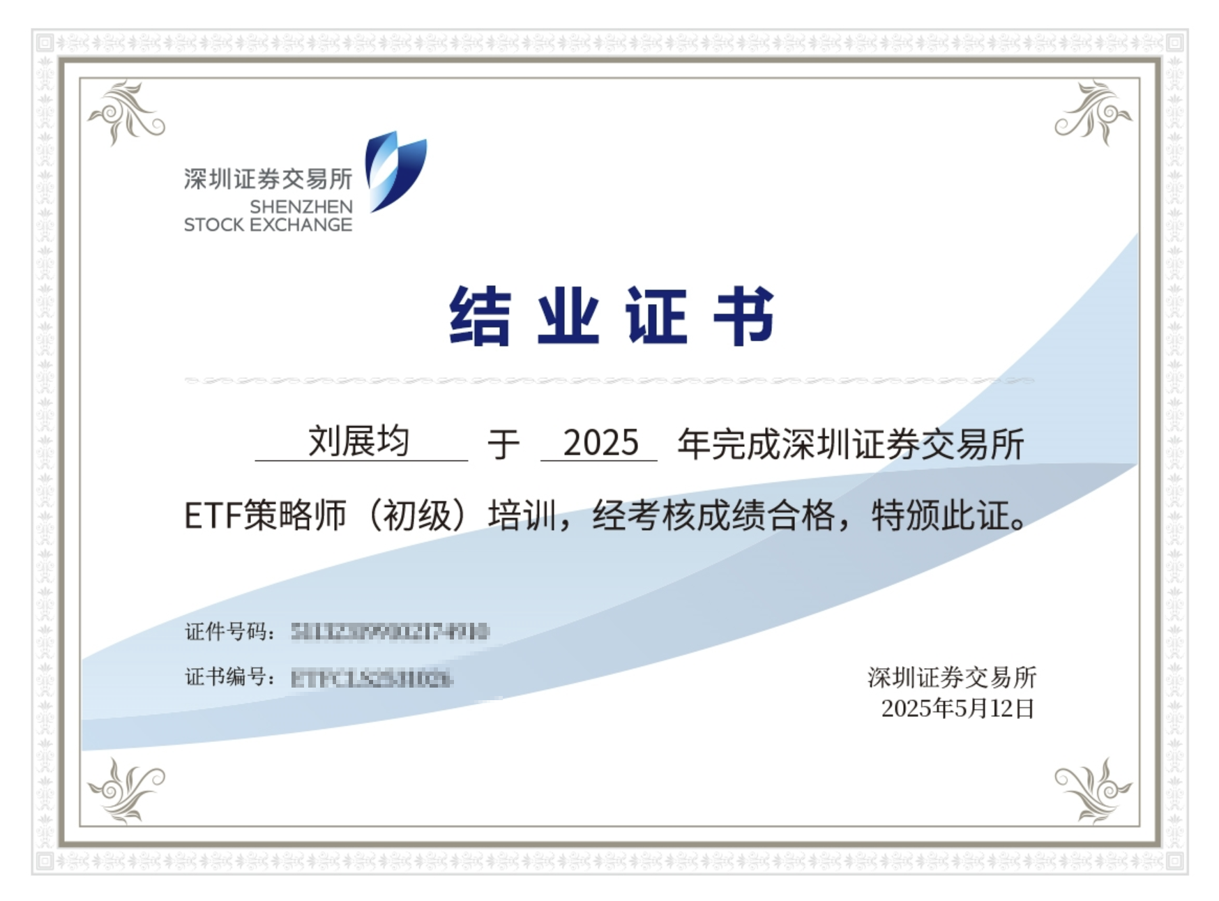 刘展均同志于2023年6月成功获得深交所联合行业机构颁发的ETF策略师(初级)认证。此次认证标志着刘展均同志在ETF策略领域取得了专业认可,并为其在相关领域的职业发展奠定了坚实基础。