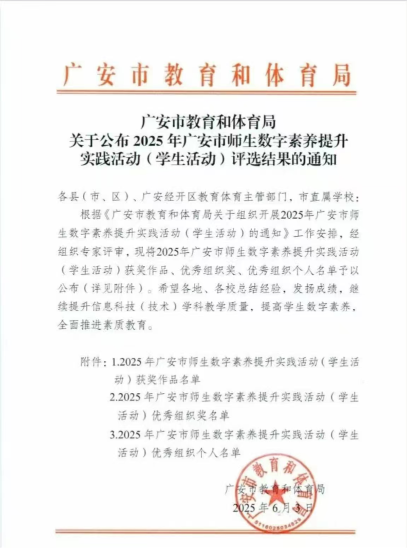 刘展均老师荣获2025年广安市师生数字素养提升实践活动(学生活动)优秀指导教师称号,这是对他辛勤付出的肯定。在本次活动中,刘老师展现了卓越的指导能力,为提升学生数字素养做出了积极贡献。以下是相关通知文件摘要: --- 尊敬的各位领导、老师: 根据《关于开展2025年广安市师生数字素养提升实践活动的通知》要求,经过严格评审,现公布2025年广安市师生数字素养提升实践活动(学生活动)优秀指导教师名单。其中,刘展均老师凭借其在指导学生参与数字素养提升实践活动中的突出表现,荣获此殊荣。 刘展均老师在教学过程中,注重培养学生的创新精神和实践能力,特别是在数字素养方面,他不仅传授知识,更注重引导学生运用数字技术解决实际问题。他的指导成果显著,得到了广大师生的一致好评。 特此通知,并对刘展均老师表示热烈的祝贺! 广安市教育体育局 2025年X月X日 ---
