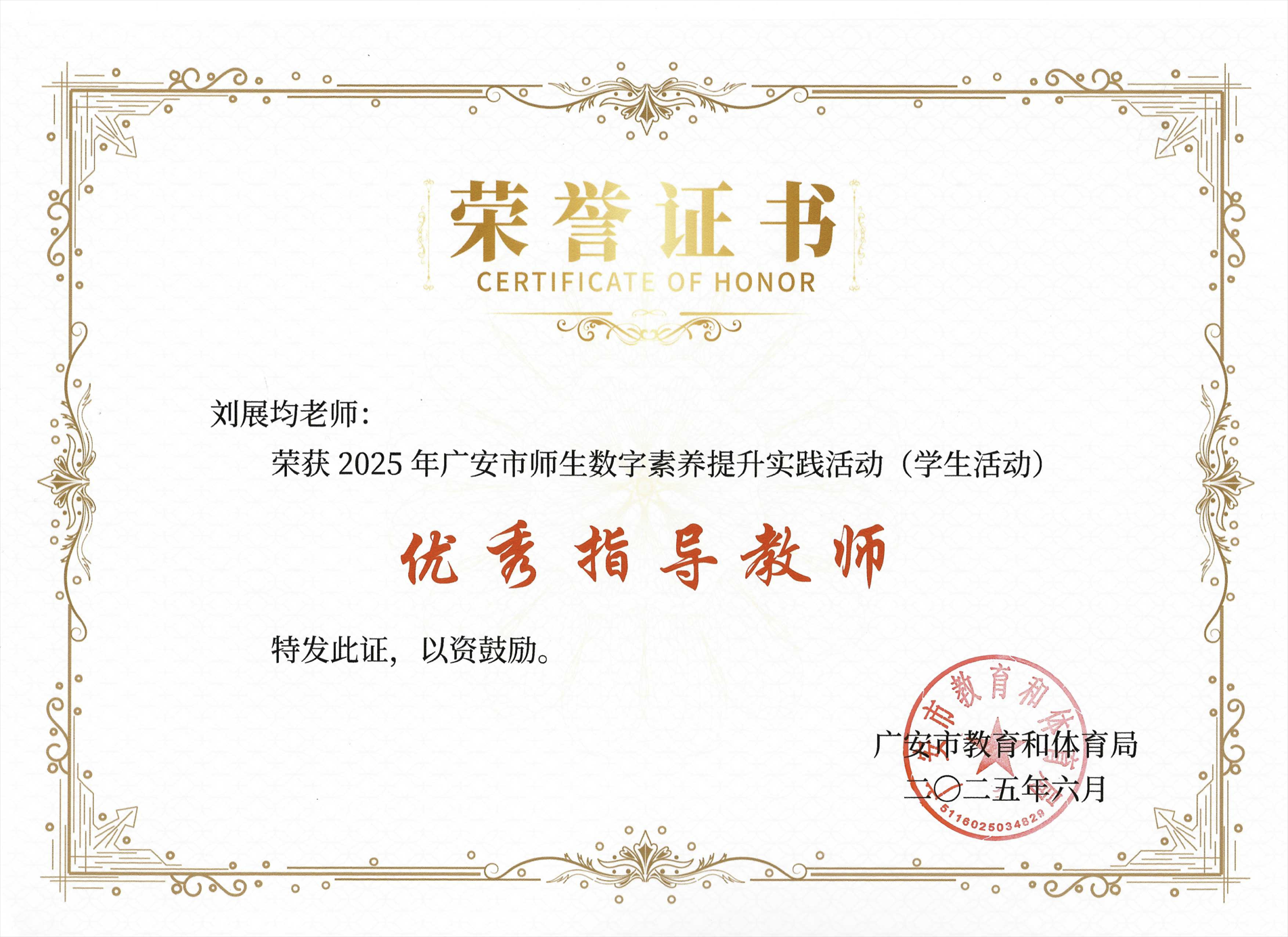 刘展均荣获2025年广安市师生数字素养提升实践活动(学生活动)优秀指导教师