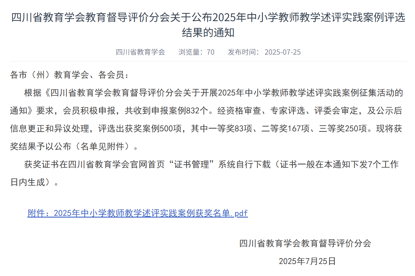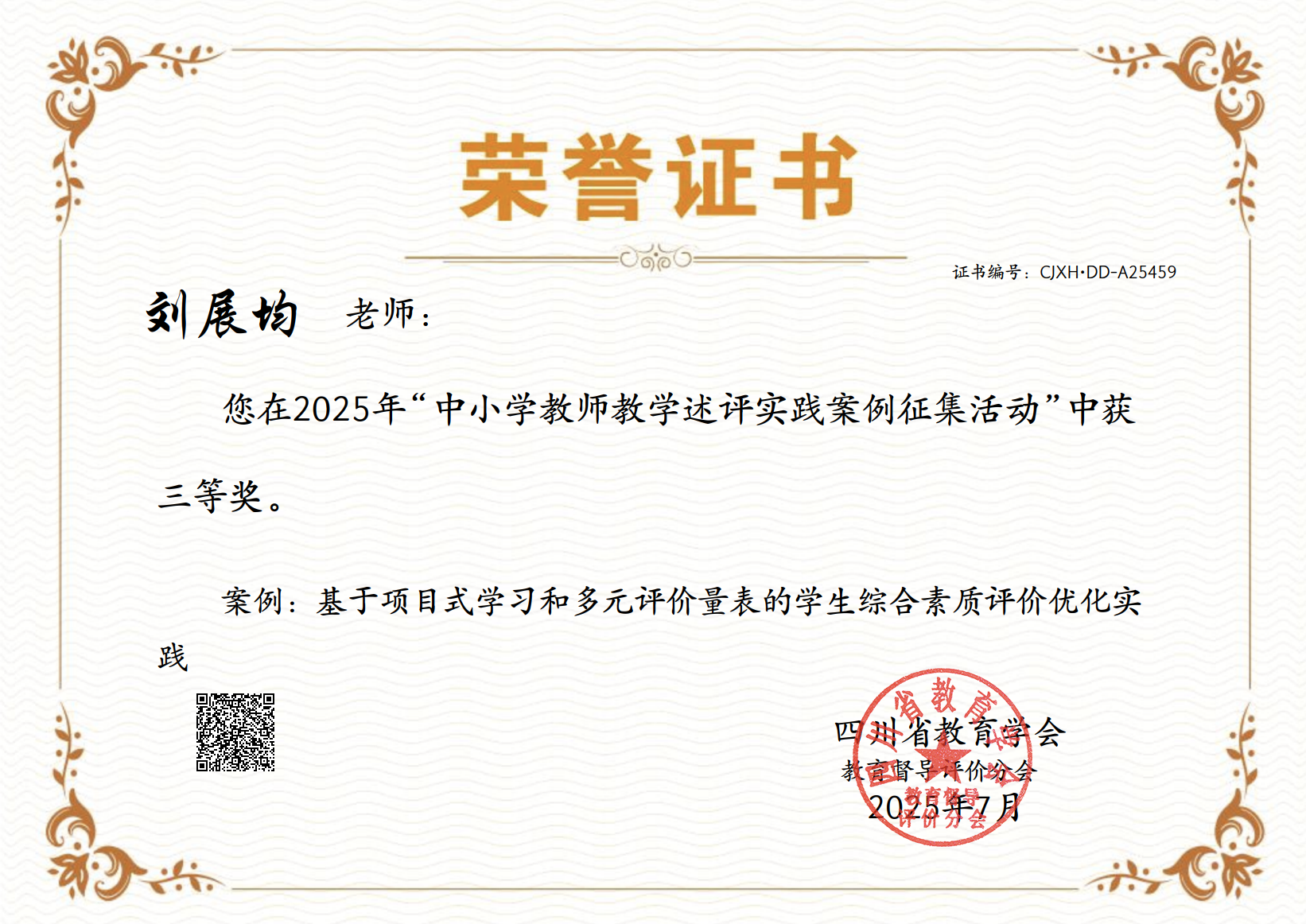 刘展均案例《基于项目式学习和多元评价量表的学生综合素质评价优化实践》在四川省教育学会教育督导评价分会主办的“2025年中小学教师教学述评实践案例评选活动”中获省三等奖。