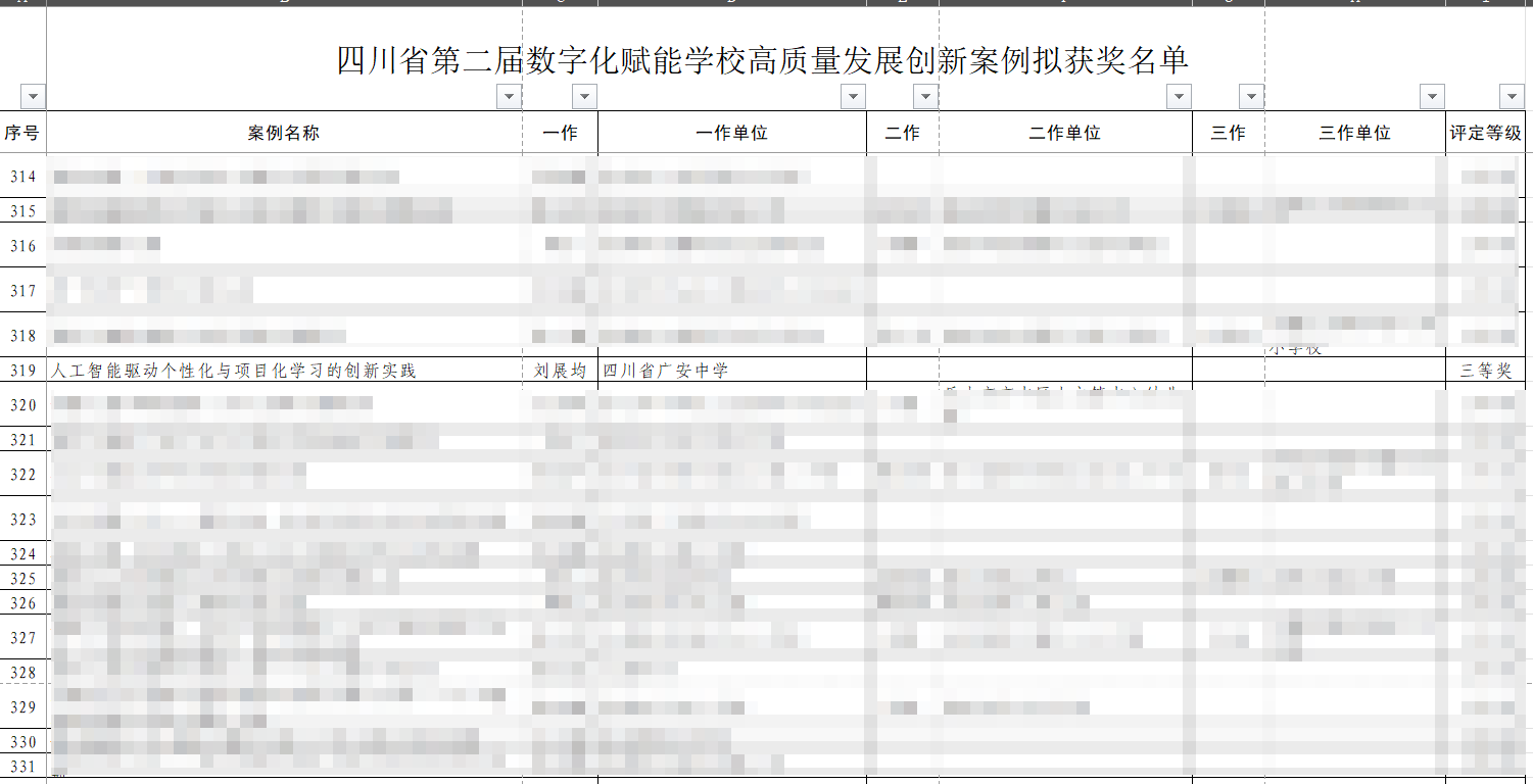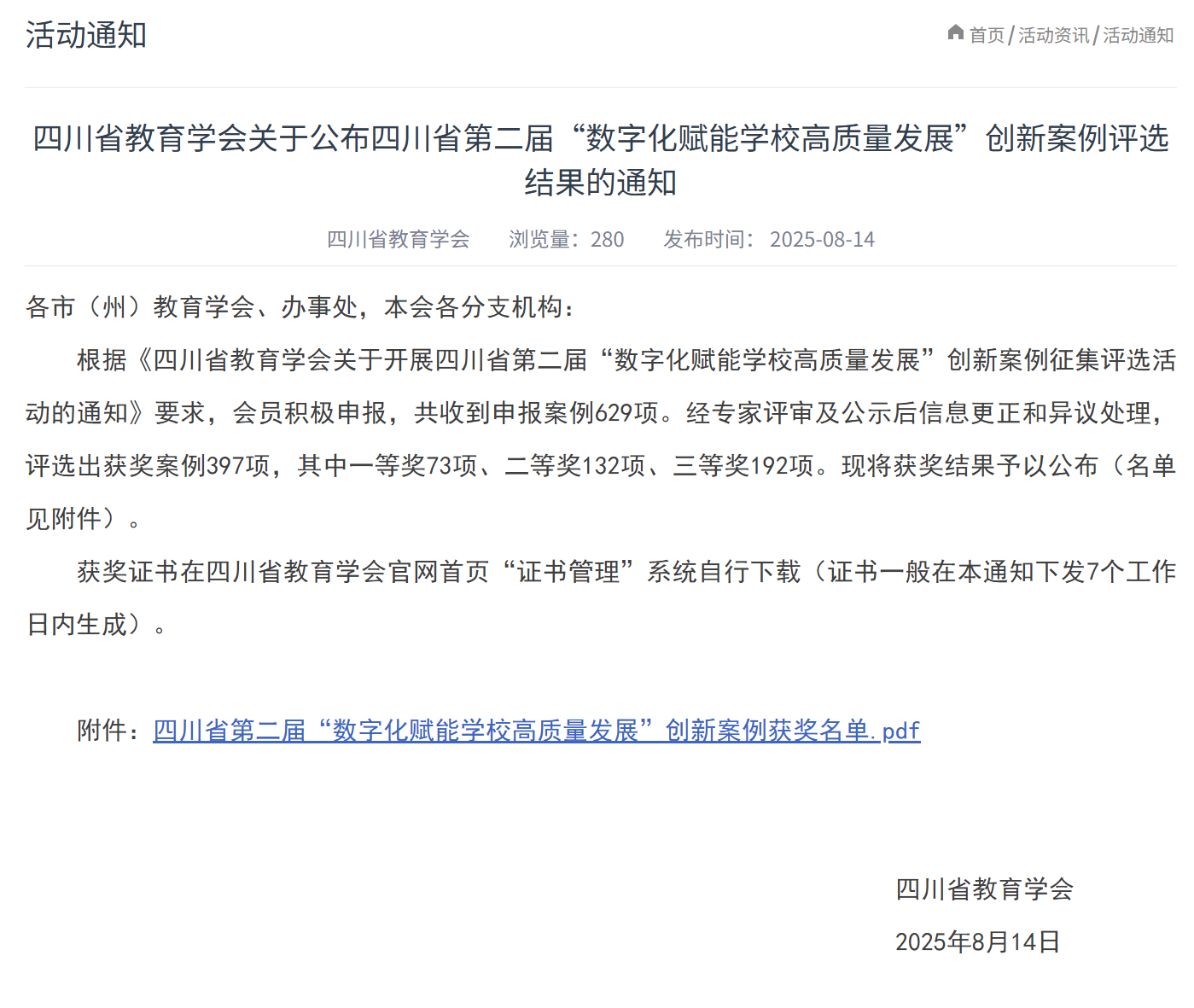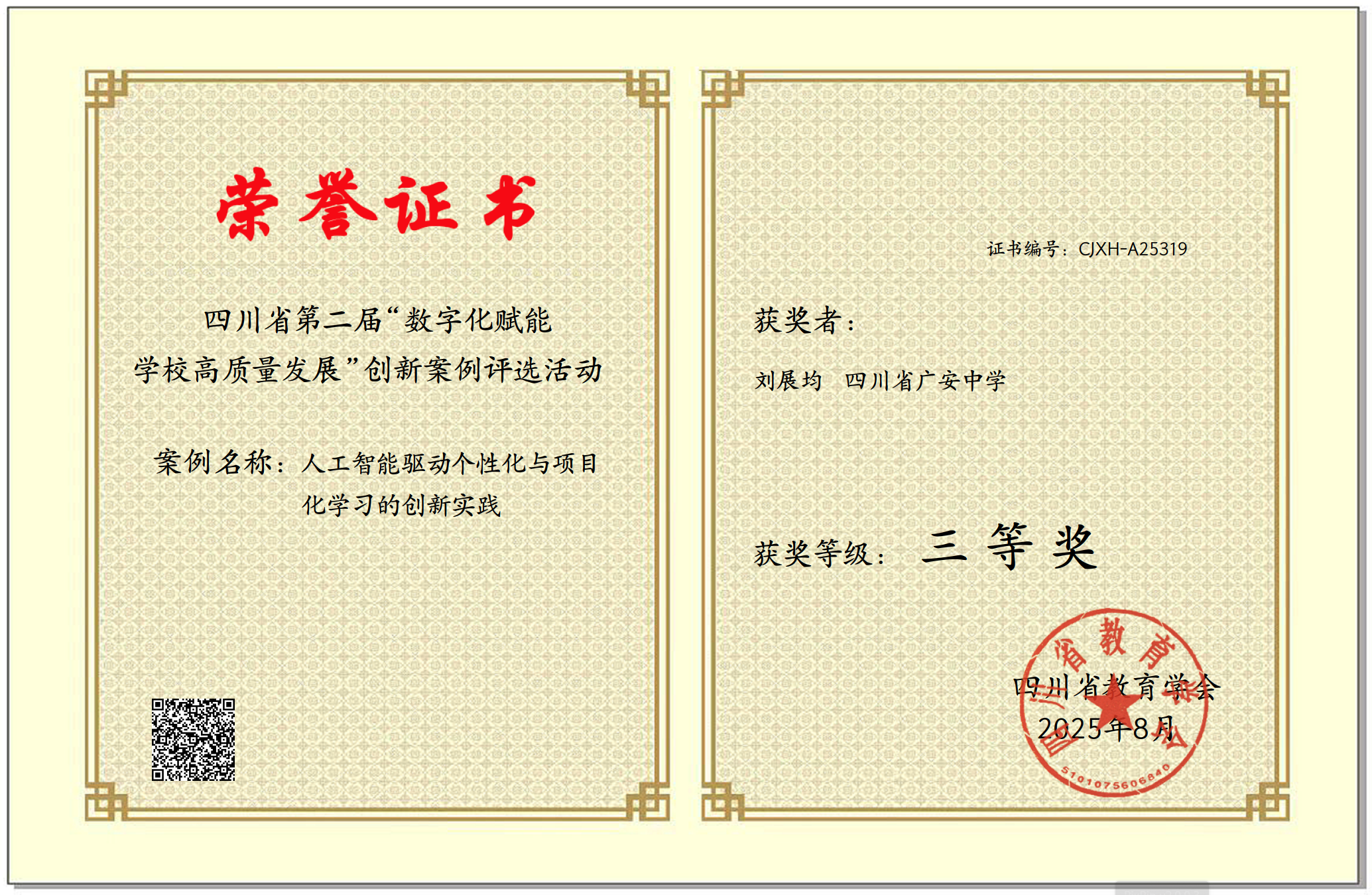 刘展均案例《人工智能驱动个性化与项目化学习的创新实践》在四川省教育学会主办的“四川省第二届‘数字化赋能学校高质量发展’创新案例评选活动”中获省三等奖。