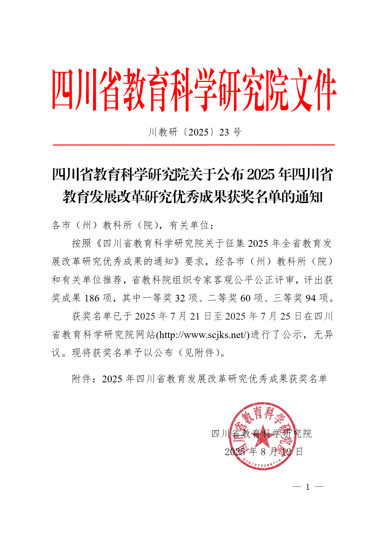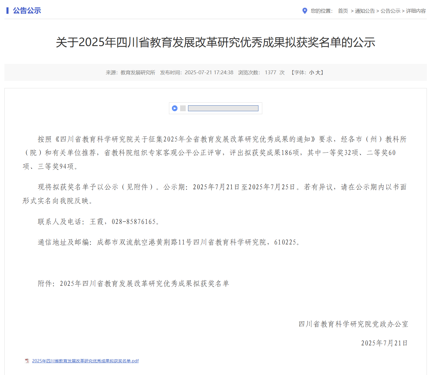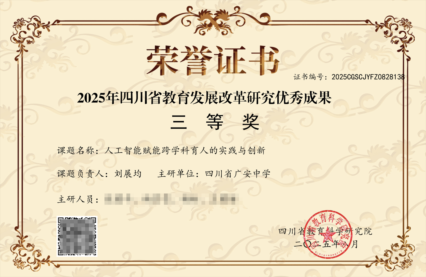 刘展均案例在2025年四川省教育发展改革研究优秀成果征集活动中获省三等奖 发布于 2025-08-13 最后更新于 2025-09-07 活动获奖 AI 摘要刘展均案例《人工智能驱动个性化与项目化学习的创新实践》在2025年四川省教育科学研究院举办的“全省教育发展改革研究优秀成果征集”活动中荣获省三等奖。该案例展示了人工智能在教育领域的创新应用,为个性化与项目化学习提供了有益探索。详情可参考公示链接:https://www.scjks.net/tzgg/gggs/content_5705。 内容目录 喜报 刘展均案例《人工智能驱动个性化与项目化学习的创新实践》在四川省教育科学研究院主办的“2025年全省教育发展改革研究优秀成果征集”活动中获省三等奖。 公示 https://www.scjks.net/tzgg/gggs/content_5705