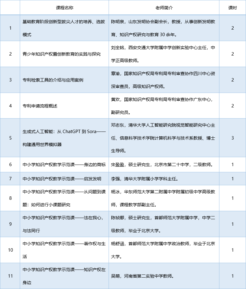 培训课程包括中小学知识产权及创新教育的开展、专利申请基本流程、专利检索工具的使用、人工智能的应用以及中小学优秀教师教学示范课程等(详细课程内容见附件),在培训班开设期间平台会持续更新课程内容。