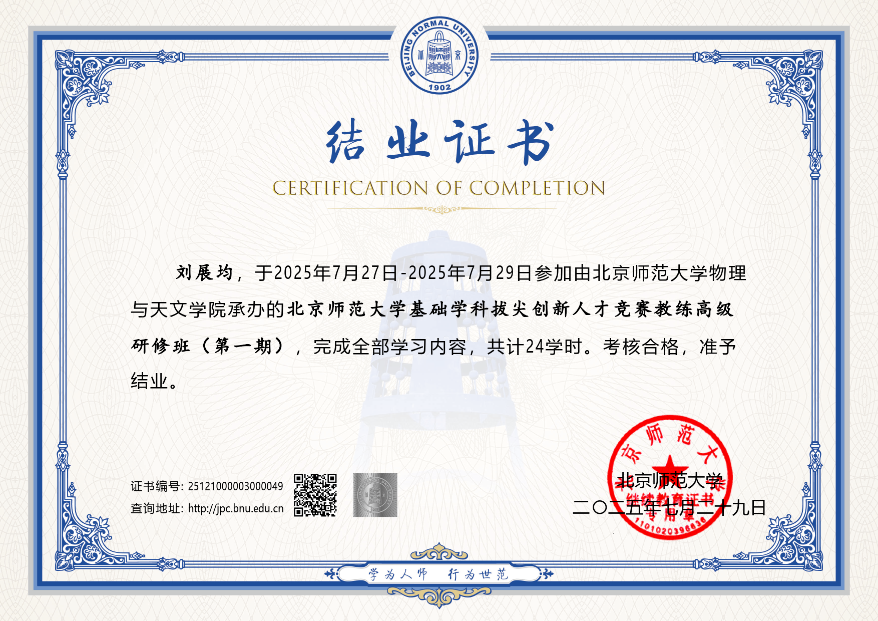 刘展均老师参加培训,在课程结束,完成闭卷考核后,获颁“拔创人才竞赛教练结业证书”。