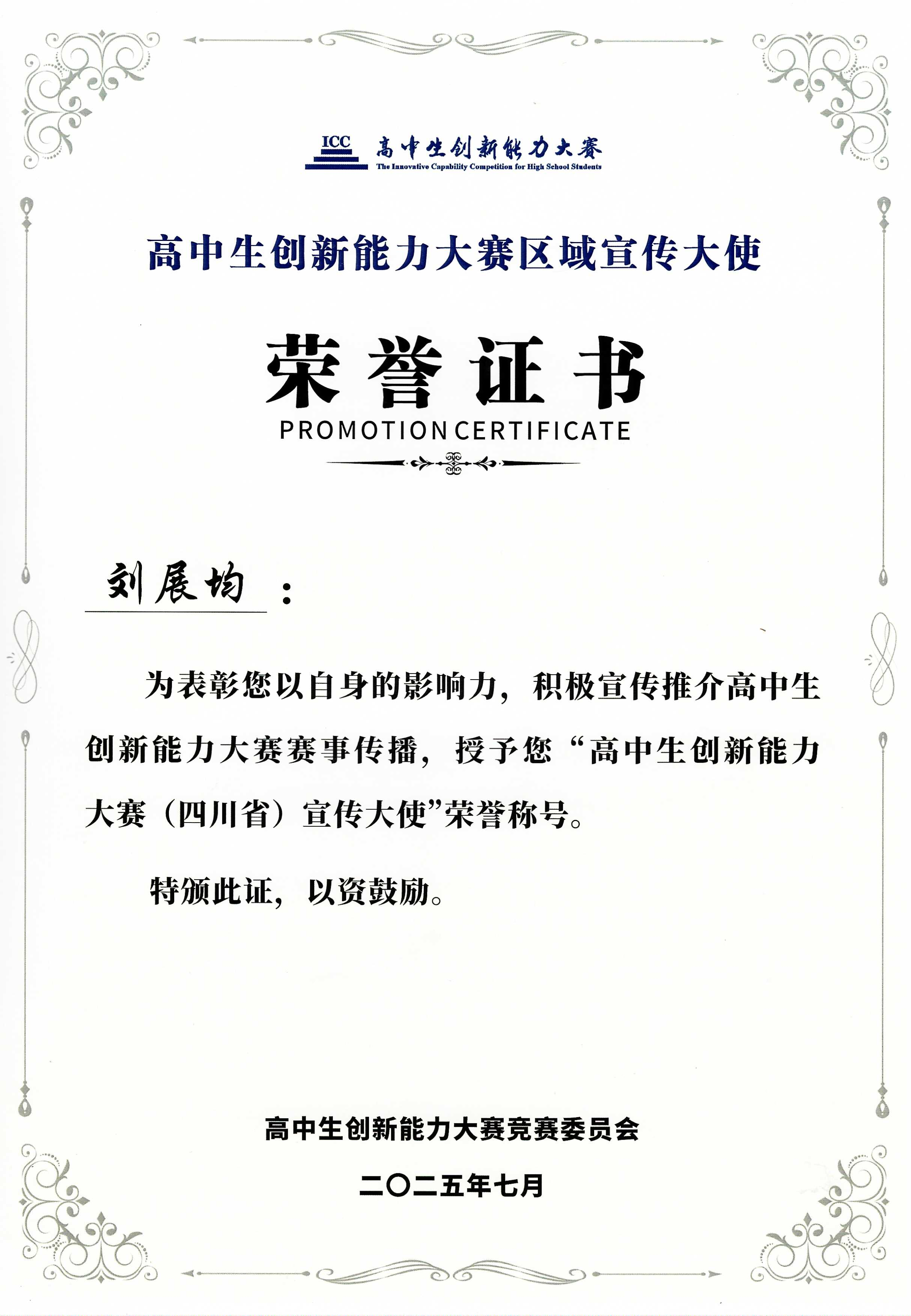 此外,为了表彰参选教练们对高中生创新能力大赛的认可及对赛事传播的推广贡献,竞赛委员会设置“区域宣传大使”荣誉,由竞委会秘书长薛芳渝颁发。