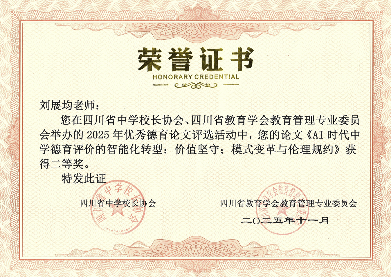 2025年9月,四川省中学校长协会教育专委会举办德育论文评选活动,共收集到804篇投稿。经过专家评审,刘展均的作品荣获省二等奖。评选过程严格遵循公平公正原则,最终评选出一等奖41篇,二等奖163篇,三等奖250篇。具体公示信息可访问链接查看。