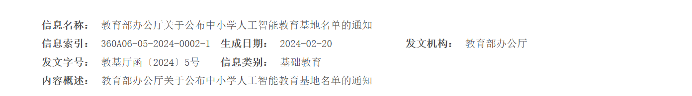 根据《教育部办公厅关于开展中小学人工智能教育基地推荐工作的通知》(教基厅函〔2023〕29号)要求,经各省级教育行政部门遴选推荐、教育部集中公示等环节,最终确定了184个中小学人工智能教育基地,现予以公布(名单见附件)。