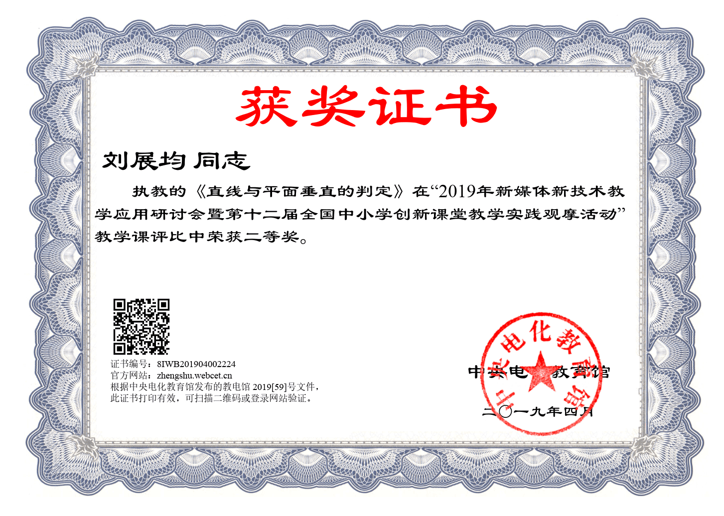 近日,由中央电化教育馆主办的“2019年新媒体新技术教学应用研讨会暨第十二届全国中小学创新课堂教学实践观摩活动”网络报课及评审工作已圆满完成,刘展均老师执教的课例《直线与平面垂直的判定》荣获教学课评比二等奖。该课例经过校内自评上报、广安区初评推荐、广安市复评推荐、四川省省评选和国家级评比五个层级的评选过程,最终从近万参赛课例中脱颖而出,成为广安市唯一获奖课例。