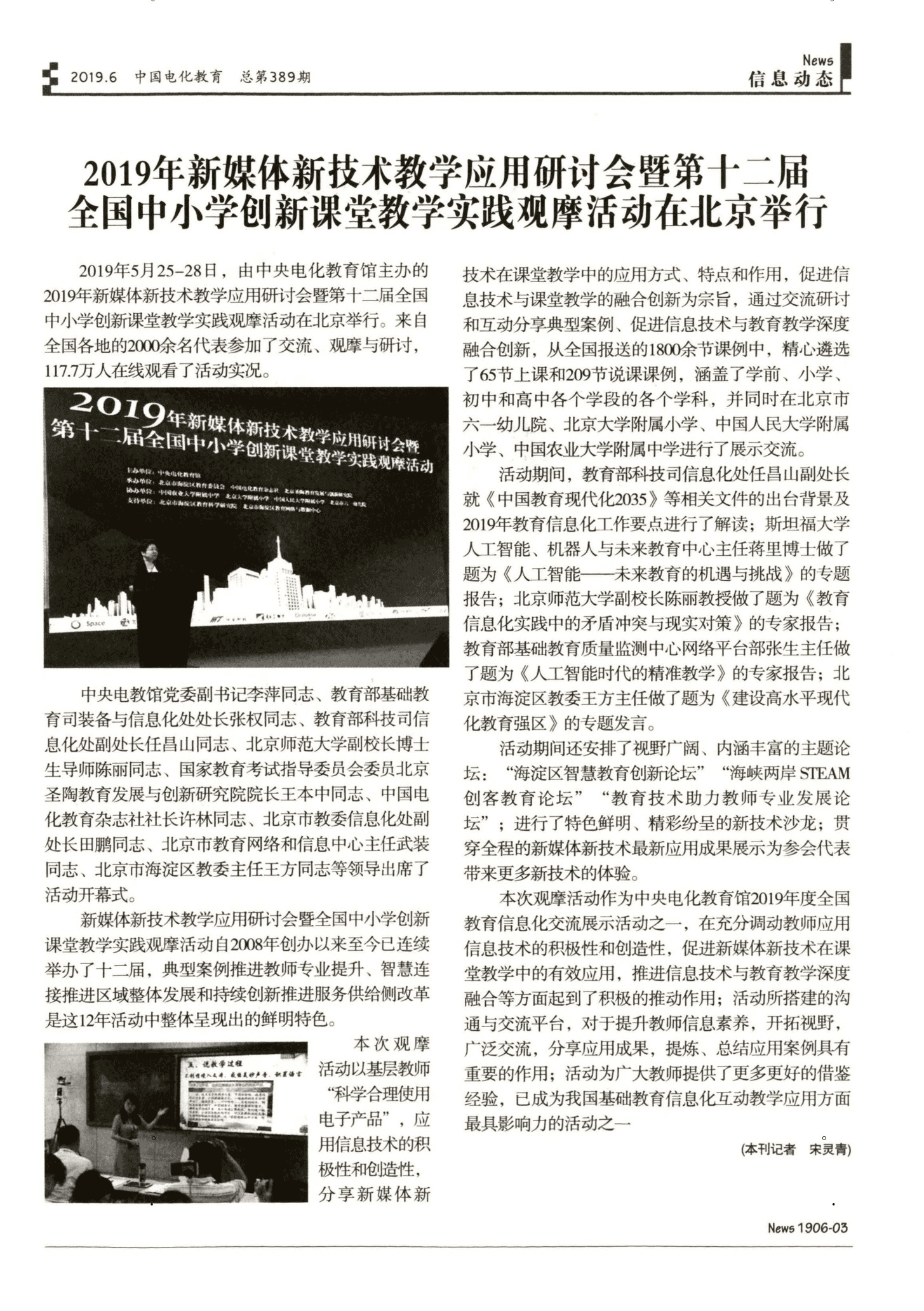 2019年5月26至28日,由中央电化教育馆主办,《中国电化教育》杂志社和北京市海淀区教育委员会承办的“2019年新媒体新技术教学应用研讨会暨第十二届全国中小学创新课堂教学实践观摩活动”在北京举行。本次会议有近3000名来自全国各地信息领域专家、中小学幼儿园的校、园长和骨干教师到场,有超过60万人在线观看直播。中央电教馆党委副书记李萍同志、教育部基础教育司装备与信息化处处长张权同志、教育部科技司信息化处副处长任昌山同志、北京师范大学副校长博士生导师陈丽同志、国家教育考试指导委员会委员北京圣陶教育发展与创新研究院院长王本中同志、中国电化教育杂志社社长许林同志、北京市教委信息化处副处长田鹏同志、北京市教育网络和信息中心主任武装同志、北京市海淀区教委主任王方同志等领导出席了活动开幕式。