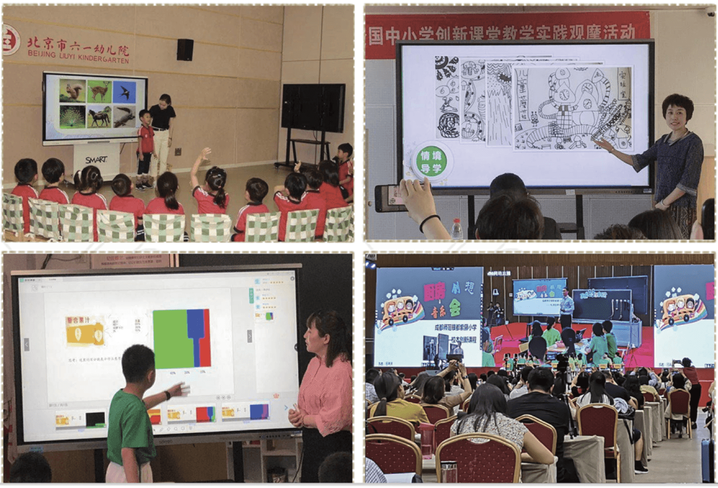 本次观摩活动以基层教师“科学合理使用电子产品”,应用信息技术的积极性和创造性,分享新媒体新技术在课堂教学中的应用方式、特点和作用,促进信息技术与课堂教学的融合创新为宗旨,通过交流研讨和互动分享典型案例、促进信息技术与教育教学深度融合创新,从全国报送的1800余节课例中,精心遴选了65节上课和209节说课课例,涵盖了学前、小学、初中和高中各个学段的各个学科,并同时在北京市六一幼儿院、北京大学附属小学、中国人民大学附属小学、中国农业大学附属中学进行了展示交流。27日大家分学科参加现场说课、上课观摩活动,来自全国各地的获奖者结合各省地区特点为大家现场展示了一节节优秀的课例设计。从他们的的精彩说课、上课中,我们看到了他们对课堂教学的深度理解,在“以学习者为中心”的教学理念引领下,将新媒体、新技术融合到各个学科的课堂中。AI创作融入项目学习,有趣的 STEAM 活动,智能机器人与学生同堂,利用人人通空间开展个性化学习,互动学习桌让交流更真实,投票器、投屏宝、现场抢答、随机抽答、随堂统计、即时评价、问卷统计等媒体和技术在课堂中的巧妙结合,使得课堂教学锦上添花,教学成果异彩纷呈。让我们在学习的同时,也真正感受到新媒体新技术在当前教育教学活动中的应用与价值。