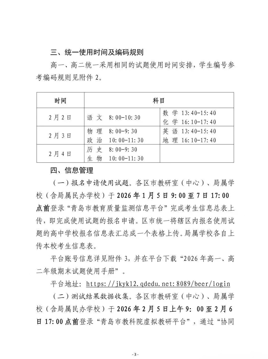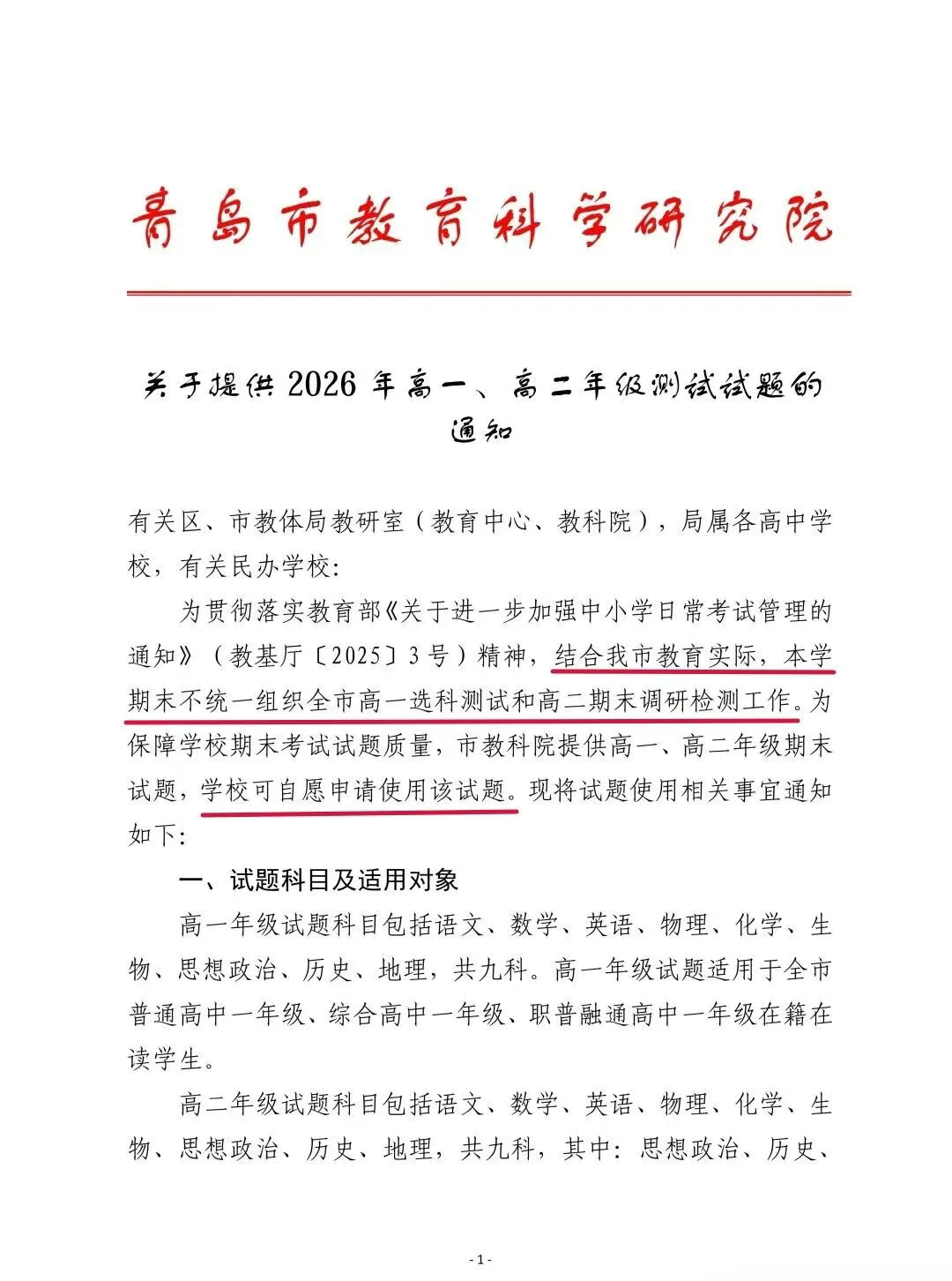 通知摘要: 为响应教育部关于加强中小学日常考试管理的政策,结合青岛市教育实际情况,市教科院决定本学期末不统一组织高一选科测试和高二期末调研检测。为确保期末考试试题质量,市教科院将提供高一、高二年级的期末试题,供学校自愿申请使用。具体使用事宜详见以下通知。