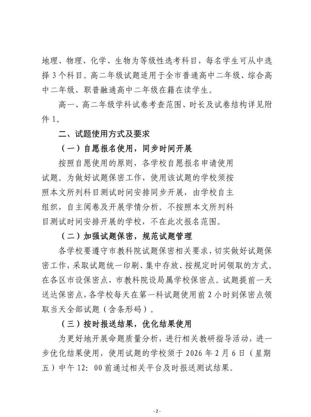 为贯彻落实教育部《关于进一步加强中小学日常考试管理的通知》(教基厅〔2025]3号)精神,结合我市教育实际,本学期末不统一组织全市高一选科测试和高二期末调研检测工作。为保障学校期末考试试题质量,市教科院提供高一、高二年级期末试题,学校可自愿申请使用该试题。现将试题使用相关事宜通知如下: