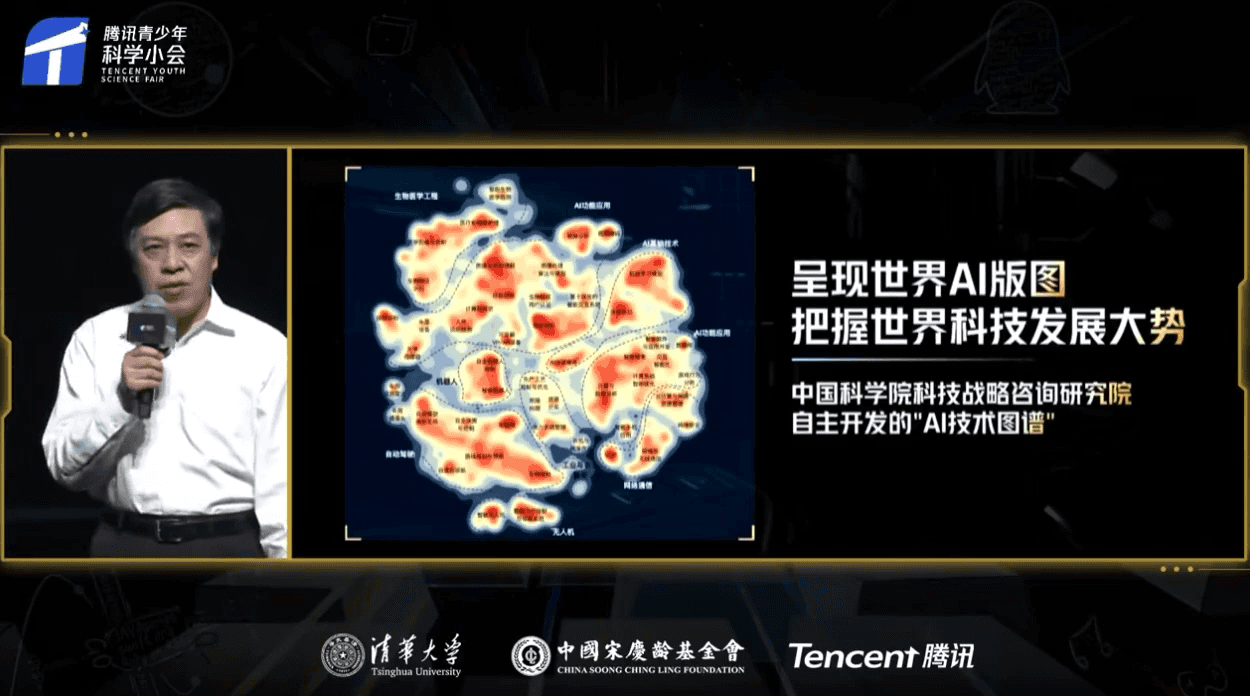 中国科学院科技战略咨询研究院院长潘教峰在科学小会上结合历次工业革命,分析了目前AI技术的发展阶段,并在会上首发由战略咨询院王小梅研究员团队利用AI算法绘制而成的《2023 AI技术图谱》,直观呈现了世界AI版图,分析了我国AI技术发展现状,为把握AI科技发展趋势提供参考。会上还动态演示了6年来我国AI各技术领域的发展变化,呈现出我国AI正在进入高速发展阶段。在图像分析、语音识别、视频分析、无人机等多个AI应用技术上,我国获得了长足发展,已达到或接近世界先进水平。潘教峰同时指出,与发达国家相比,我国在AI基础技术特别是AI硬件技术方面,仍存在较大差距。他希望青少年朋友们要重点关注数学、物理学、脑科学等基础学科的学习,为中国构建自主可控的AI技术体系贡献力量。