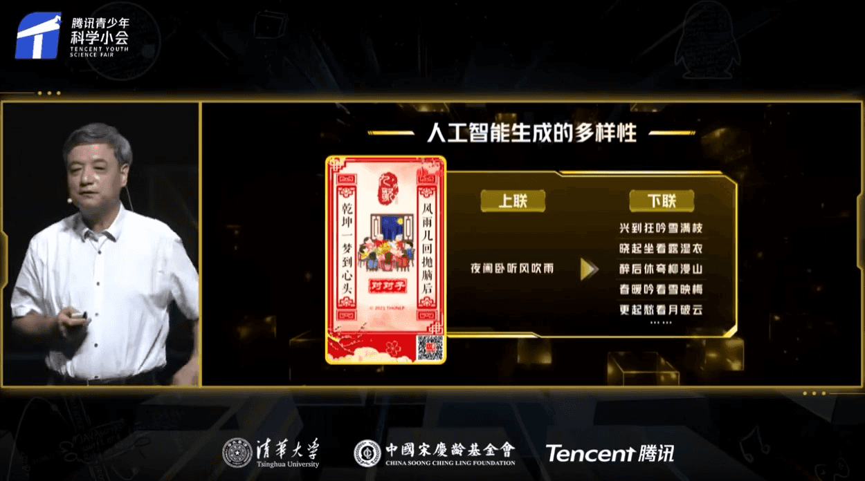 清华大学人工智能研究院常务副院长孙茂松携团队2015年起自研的AI诗歌写作模型“九歌”,向青少年科普生成式AI背后的自然语言处理技术。孙茂松介绍,中国传统诗词讲究韵律和对仗工整,蕴含深远意象,语义表达也更为丰富、复杂,“九歌”基于古典诗词大数据,设计并构造了诗词及对联AI自动写作系统,攻坚AI的中文理解和分析能力。“岭上松杉照眼青,水边阁楼列窗棂。幽居远对三峰碧,僧舍分明隐雾屏。”他用一首“九歌”创作的七言绝句,引导青少年领略传统文化与前沿科技碰撞的魅力。