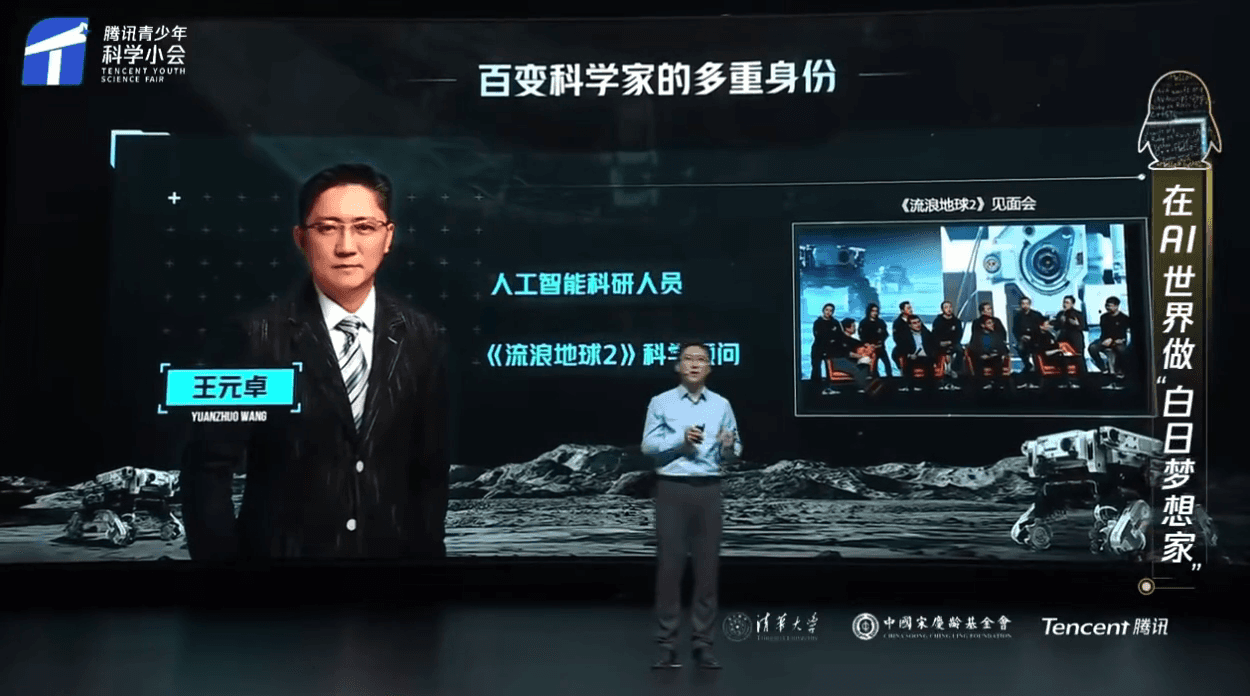 中国科学院计算技术研究所研究员王元卓是电影《流浪地球2》的科学顾问。在小会现场,他结合电影人物和剧情,解读了2044年的科技发展设定。王元卓身处小会现场,展示了同时在视频号直播间回答问题,和正给乡村孩子做科普的“王元卓”。现阶段,腾讯智影数字人技术仅需3分钟真人视频素材,便能打造出“真假难辨”的数字分身,帮助人们处理一些自身无法同步进行的事情。王元卓认为,未来随着技术发展,电影中“丫丫 ”这样具备自我意识的数字生命,将无限接近于现实。
