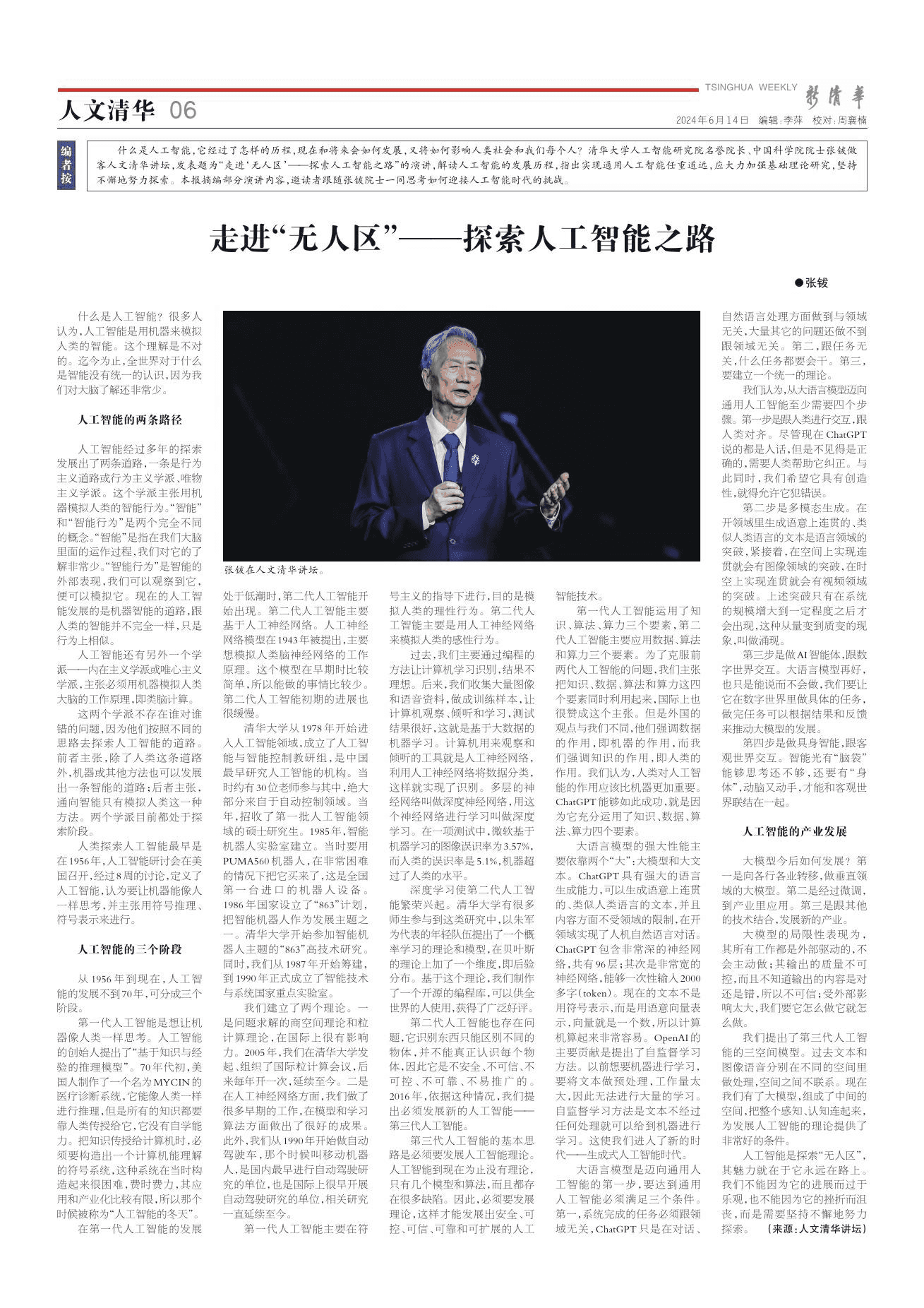 2024年4月23日,中国科学院院士、中国人工智能研究的奠基人、清华大学计算机系教授张钹在“人文清华讲坛”上发表演讲《走进“无人区”——探索人工智能之路》,为大家解读人工智能的发展历程。他指出,发展人工智能是探索“无人区”,我们不能因为它有了进展而过于乐观,也不能因为它遭受挫折而沮丧,最重要的是要坚持不懈地努力。