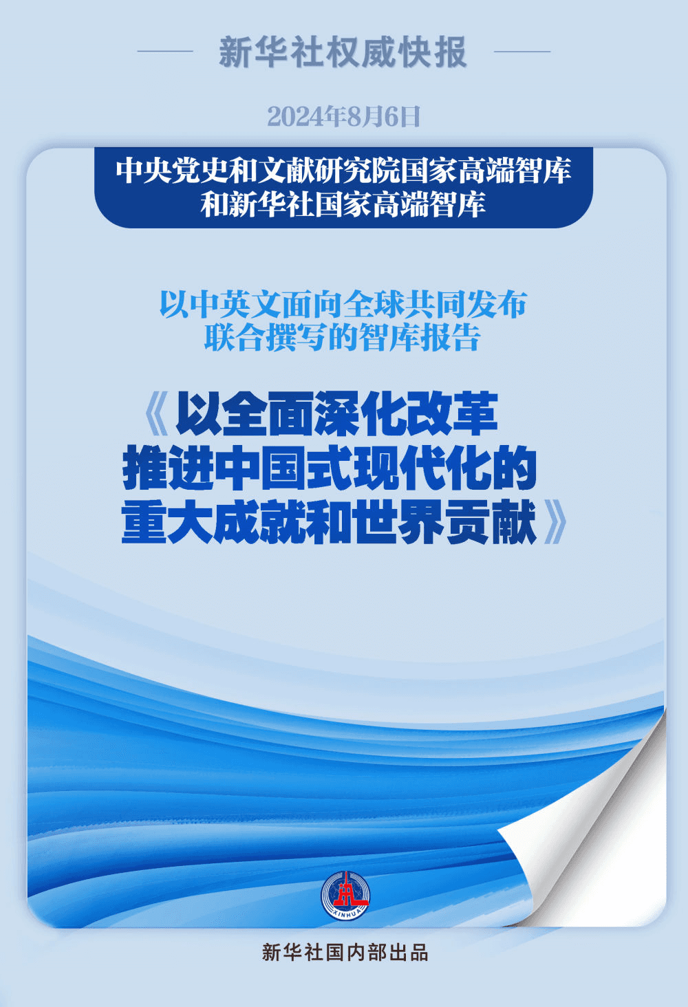 “红厅论坛:读懂中国共产党二十届三中全会”主题研讨会8月6日在中国共产党历史展览馆红色大厅举行。会上,中央党史和文献研究院国家高端智库和新华社国家高端智库以中英文面向全球共同发布联合撰写的智库报告《以全面深化改革推进中国式现代化的重大成就和世界贡献》。报告全文约2.4万字,系统总结了新时代以来中国共产党以全面深化改革推进中国式现代化的重大成就、基本遵循和世界贡献。