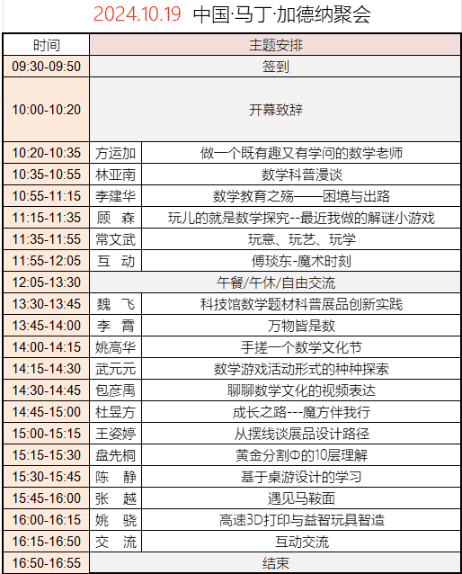2024年10月19日,趣味数学科普大讲堂暨第十五届中国纪念马丁·加德纳聚会在中国科技馆举行。本次活动以“趣味数学科普大讲堂”为主题,邀请近二十位国内知名数学教育、科普领域专家学者为公众带来别开生面的趣味数学科普讲座和精彩的数学主题互动表演。