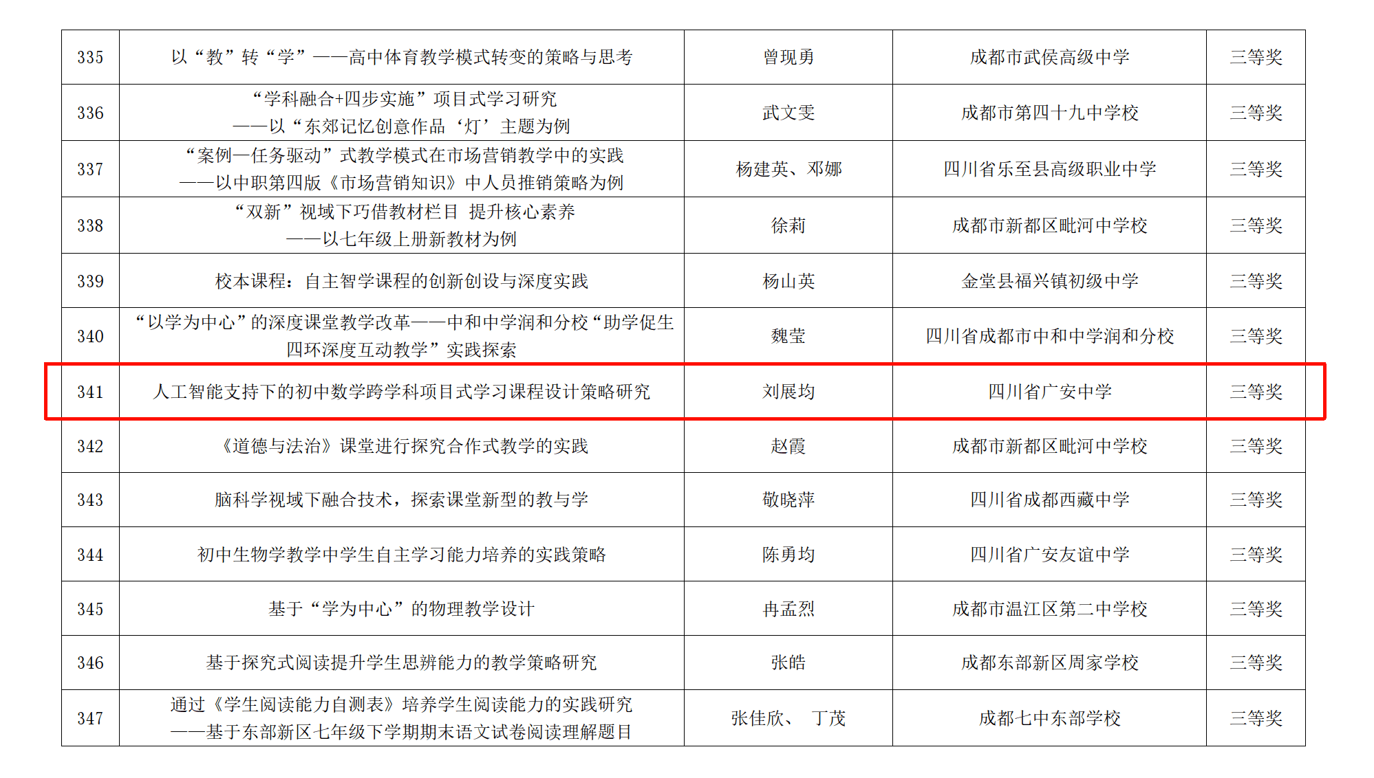 近日,四川省教育学会教学改革专业委员会公布了2024年“以学为中心,培养学生自主学习能力”优秀论文征集评选活动结果,刘展均案例《人工智能支持下的初中数学跨学科项目式学习课程设计策略研究》获三等奖。