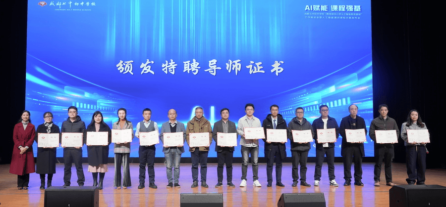 成都高新区教育体育局党组成员、一级调研员、成都高新区管委会总督学匡世联为成都七中初中学校人工智能教育特聘专家颁发聘书。