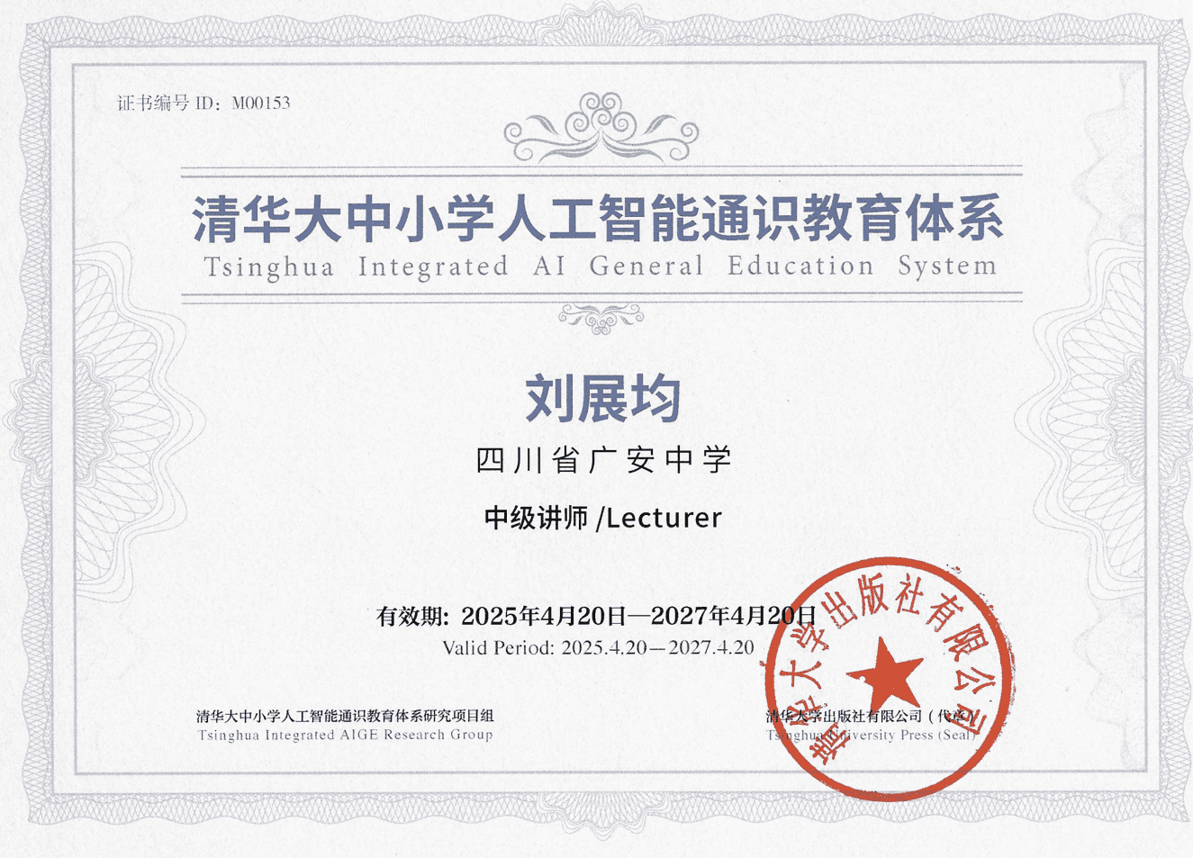 近日,刘展均参与清华大中小学人工智能通识教育体系项目组组织的远程答辩,经过与会三位高级讲师一致认可,成功获得中级讲师认证。