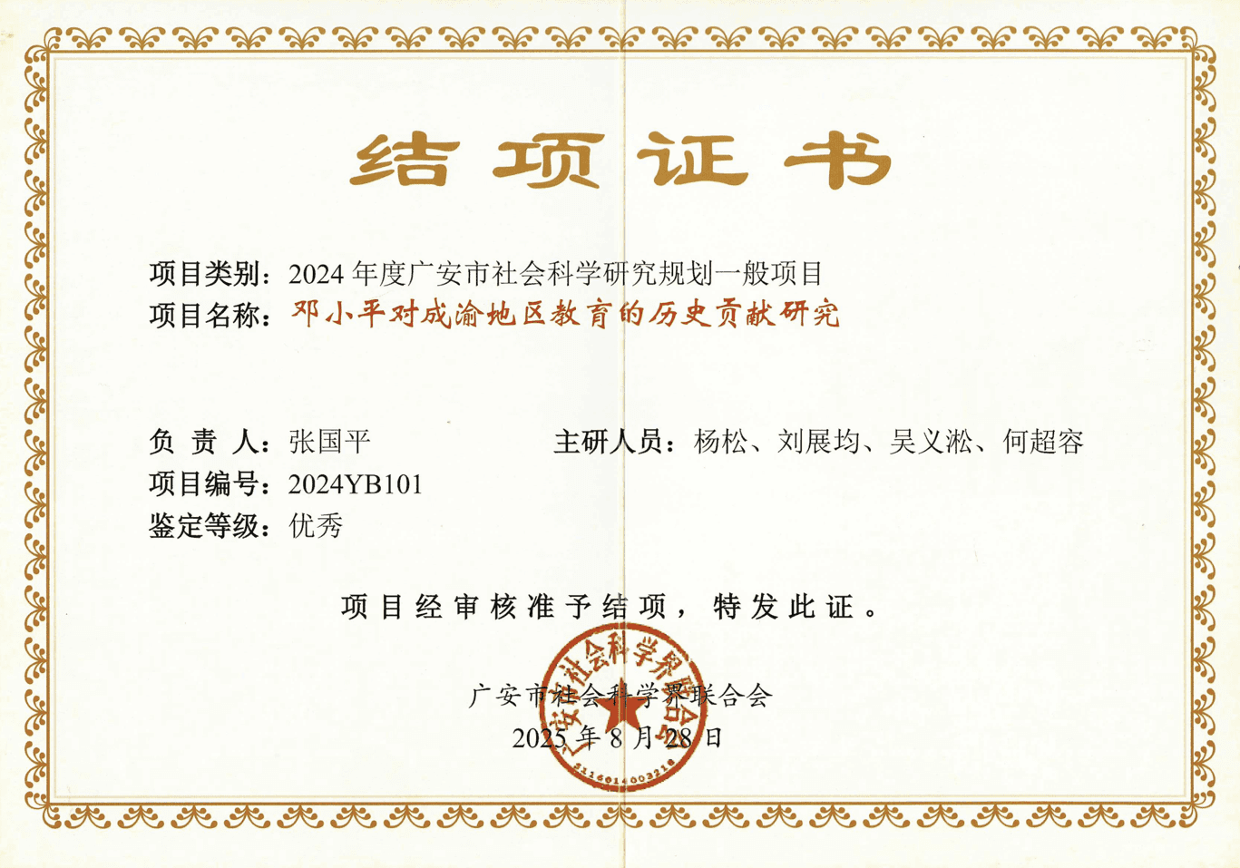近日,广安市社会科学界联合会公布了2024年度广安市社会科学研究规划项目结项名单,刘展均参研一般项目《邓小平对成渝地区教育的历史贡献研究》(2024YB101)顺利结项并获得优秀等级。