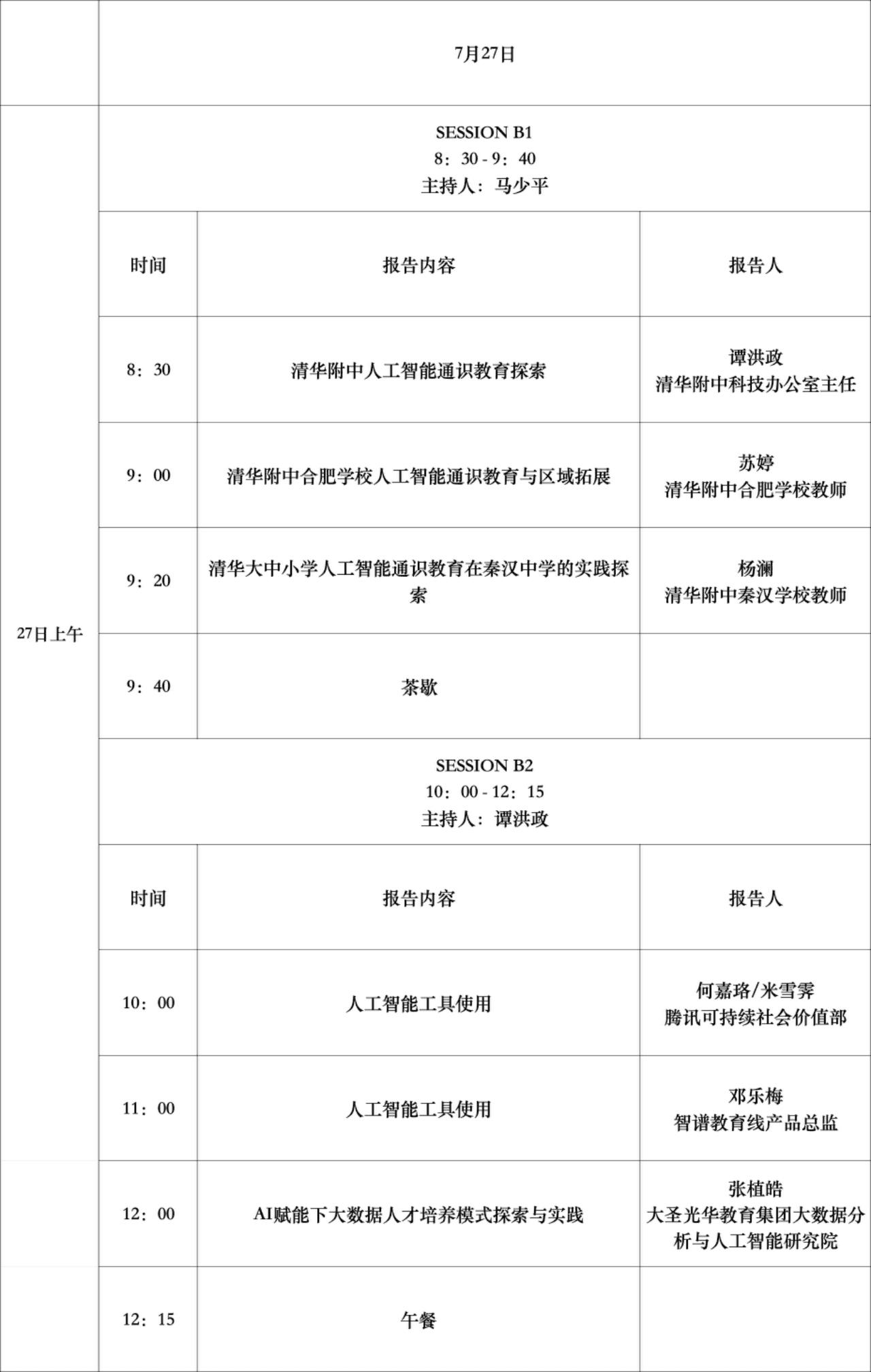 清华附中大兴学校副校长张月英围绕主题“数智未来学校建设 人工智能教育的学校探索”、清华大学附属小学韩沐霏围绕主题“清华附小语文主题教学垂直专用模型与建设——让小学语文教师跑步进入人工智能时代”、中国人民大学附属中学高级教师袁继平围绕主题“人大附中人工智能通识教育探索”。