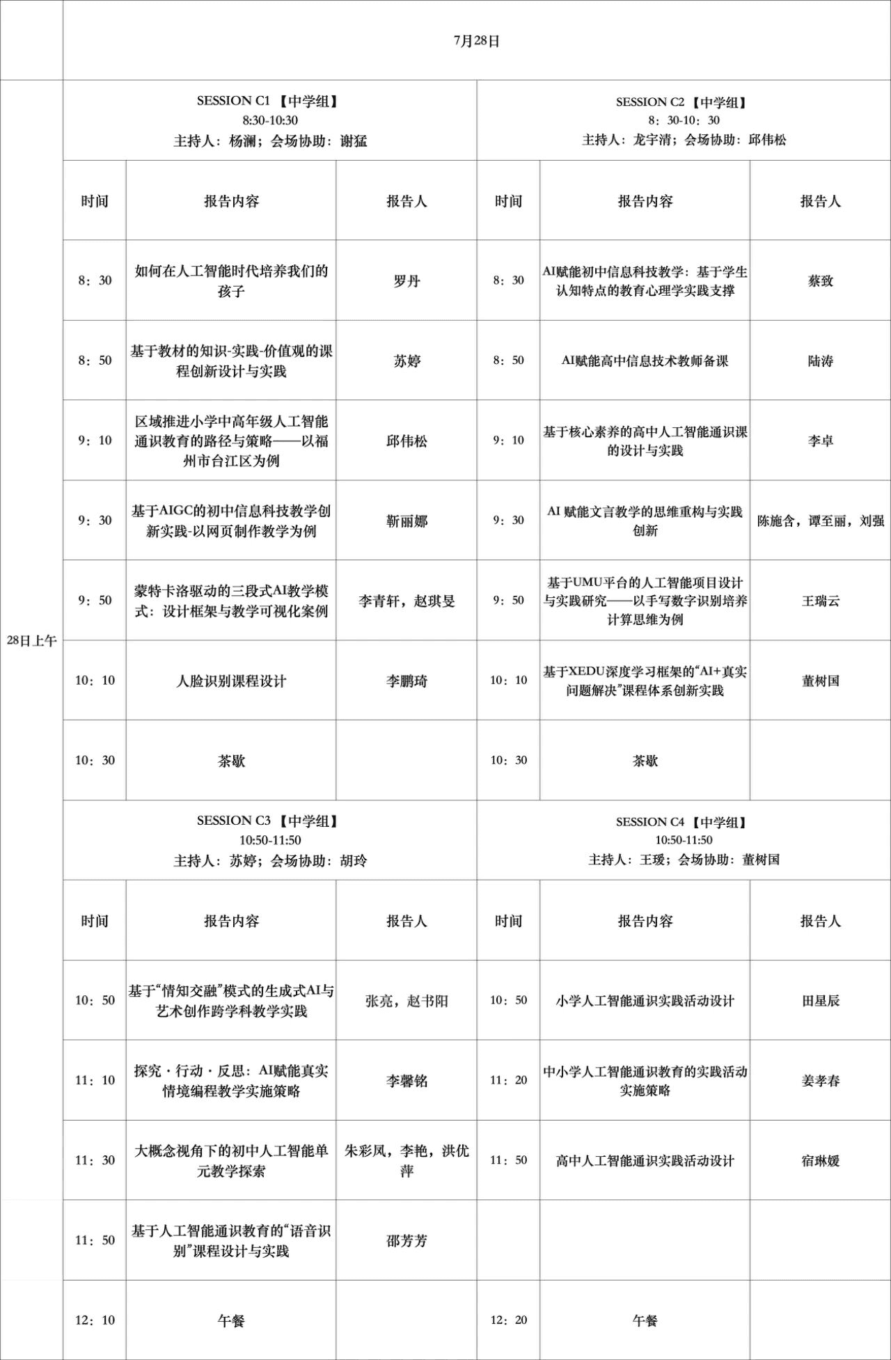 7月27日下午,7月28日全天,九个小学组、中学组、高等教育组分会场会议同步举行。来自全国各地的大中小学教师们结合自身教授的学科,分享了人工智能通识教育的实施路径及相关探索工作,通过分享交流活动鼓励一线教师走上人工智能通识教育的讲台。