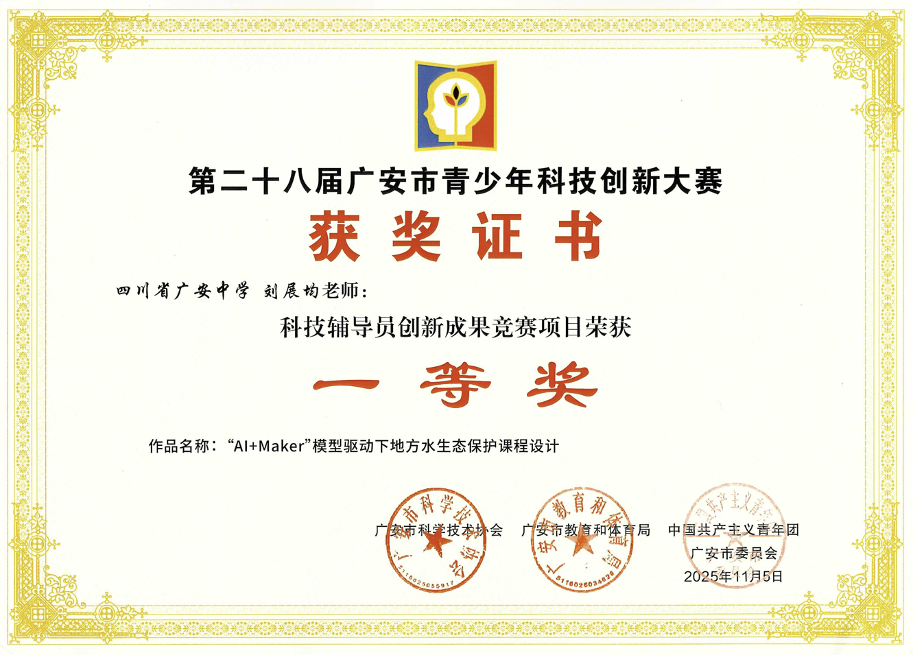 刘展均《“AI+Maker”模型驱动下地方水生态保护课程设计》获第二十八届广安市青少年科技创新大赛科技辅导员创新成果科教方案作品一等奖。据了解,此次大赛共收到各县(市、区)及市直属学校作品251件,其中中小学生科技创新成果竞赛项目122件、科技辅导员创新成果竞赛项目58件、青少年科技影像作品71件。本方案紧密结合当前科技前沿与地方实际,巧妙融合人工智能(AI+)与创客(Maker)教育理念,为青少年深入学习水生态保护知识、提升实践创新能力提供了全新的视角和高效的方案,充分展现了其前瞻性、科学性与实践价值。