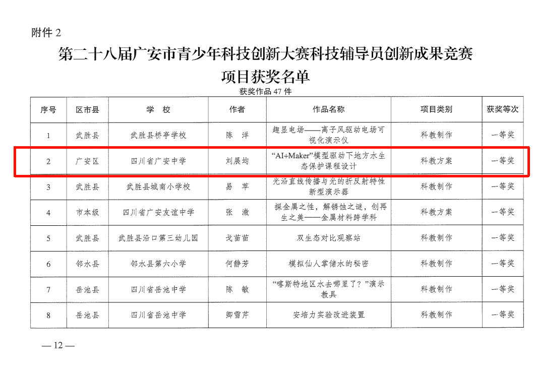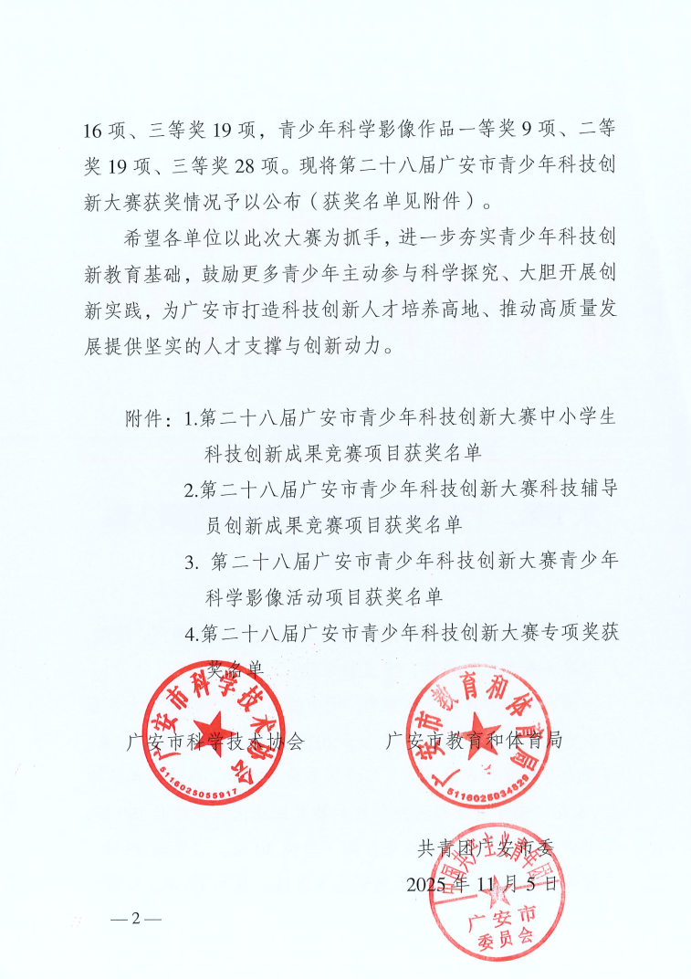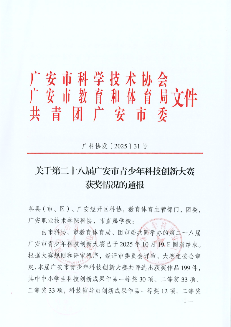 近日,由广安市科协、市教育体育局、团市委联合举办的第二十八届广安市青少年科技创新大赛获奖榜单正式揭晓。此次大赛共收到各县(市、区)及市直属学校作品251件,其中中小学生科技创新成果竞赛项目122件、科技辅导员创新成果竞赛项目58件、青少年科技影像作品71件。本校师生凭借扎实的科学素养与突出的创新实践能力,在中小学生科技创新成果、科技辅导员创新成果、青少年科学影像作品三大竞赛板块中多点开花,斩获多项荣誉,充分彰显了学校在青少年科技创新教育领域的深厚积淀与卓越成效。