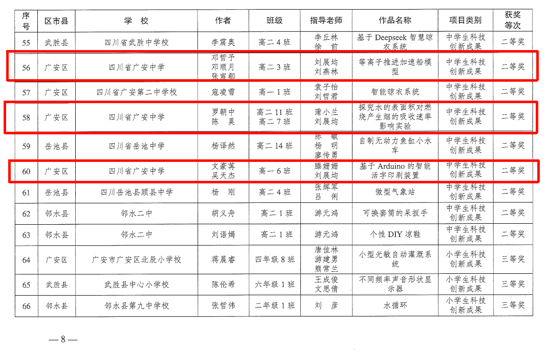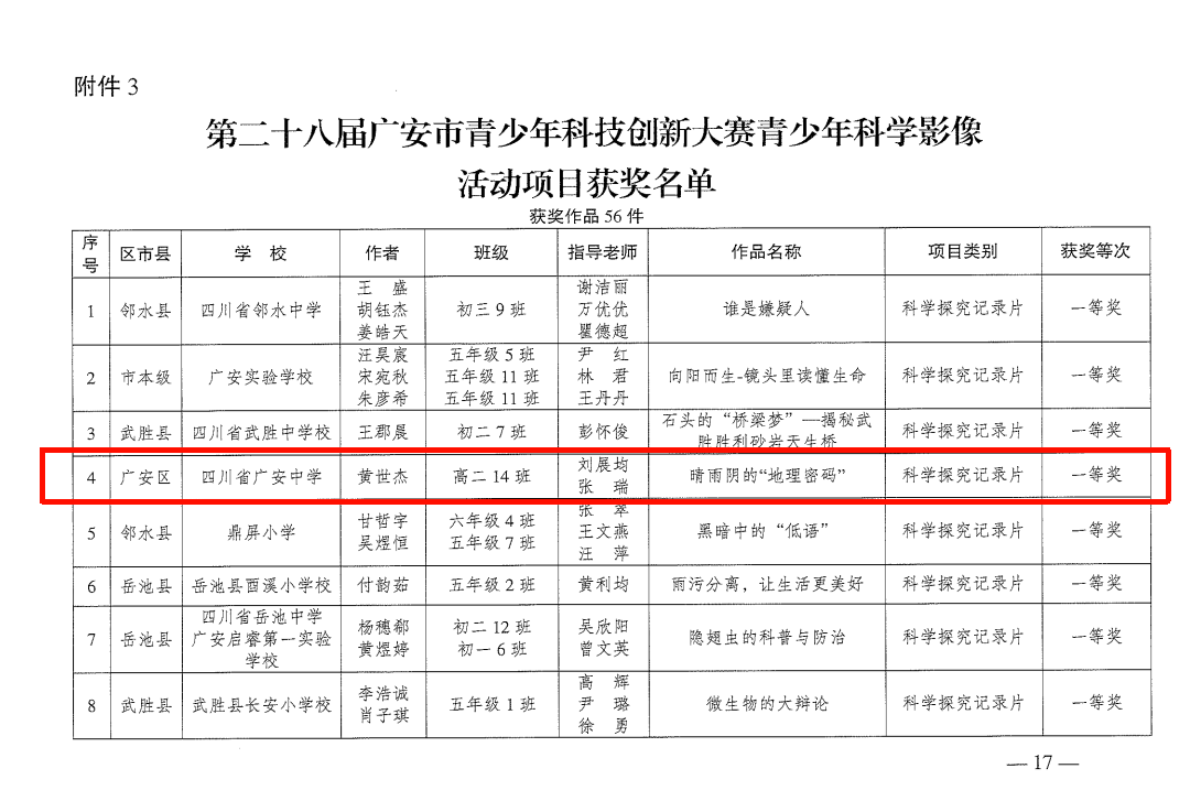 第二十八届广安市青少年科技创新大赛一等奖及专项奖拟获奖名单公示