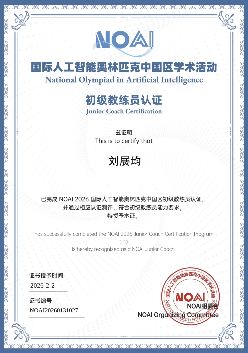 在近日圆满落幕的 NOAI(National Olympiad in Artificial Intelligence)首届教练员认证活动中,刘展均老师凭借扎实的专业功底与对人工智能教育的深刻理解,顺利通过考核,成功获得 NOAI 教练员资格认证!