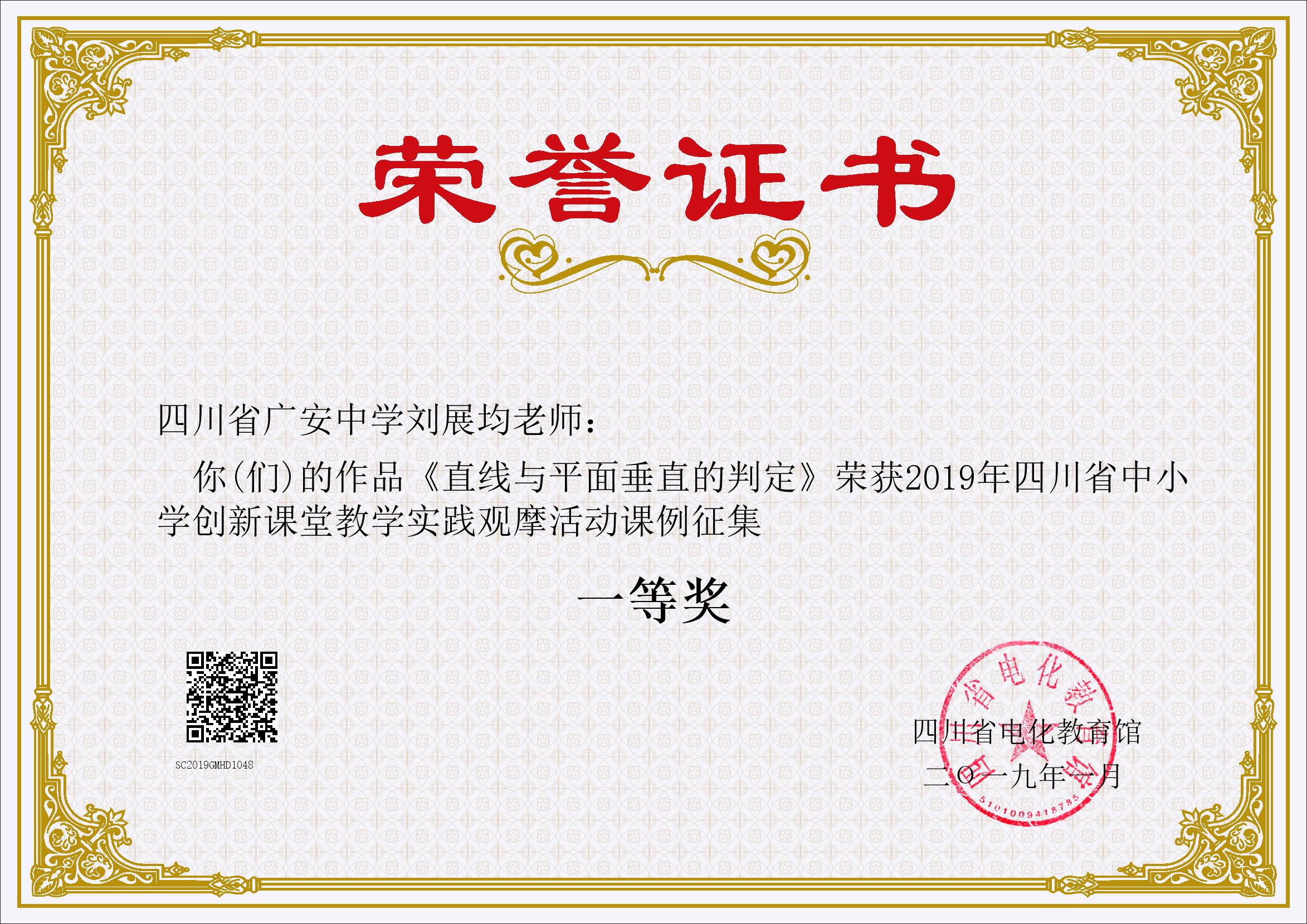 热烈祝贺刘展均老师的课例《直线与平面垂直的判定》在2019年举办的四川省中小学创新课堂教学实践观摩活动课例征集活动中荣获一等奖(川教馆[2019]3号)!