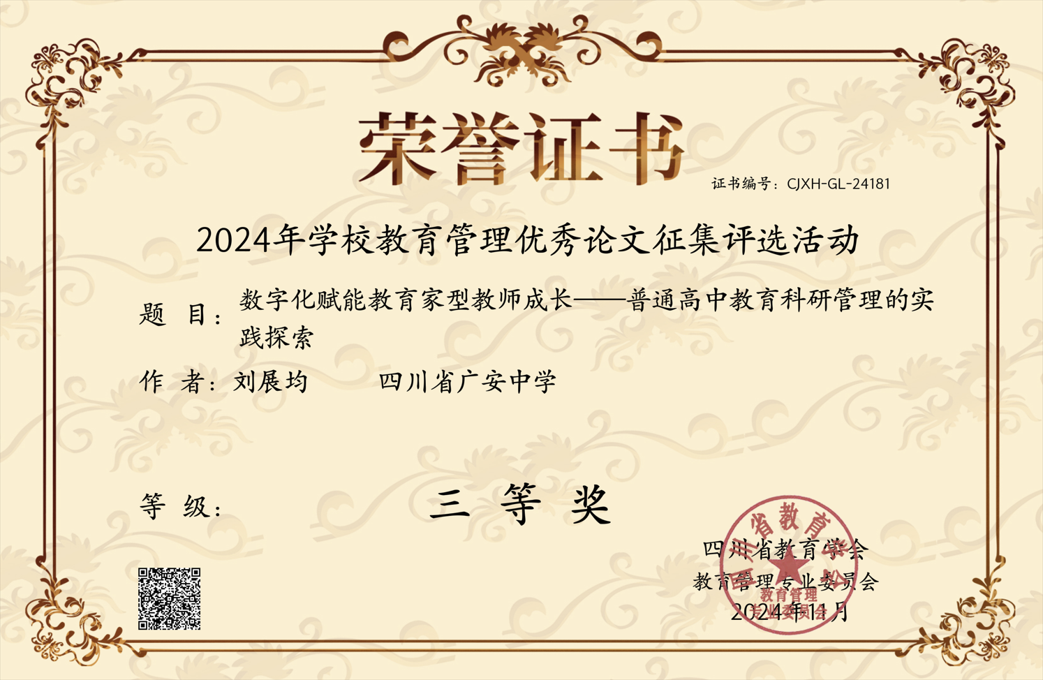 刘展均老师的论文在“四川省2024年学校教育管理优秀论文征集评选”活动中获得省三等奖。本次活动共收到申报论文343篇,经专家公开、公平、公正的评审,评出拟获奖论文240篇,其中一等奖34篇,二等奖86篇,三等奖120篇。