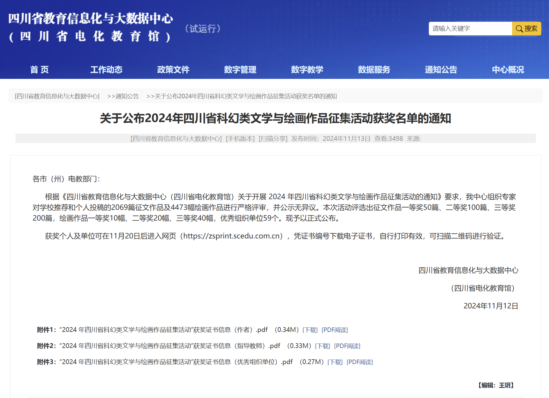关于公布2024年四川省科幻类文学与绘画作品征集活动获奖名单的通知:https://www.scedu.net/p/8/?StId=st_app_news_i_x638671098794213200