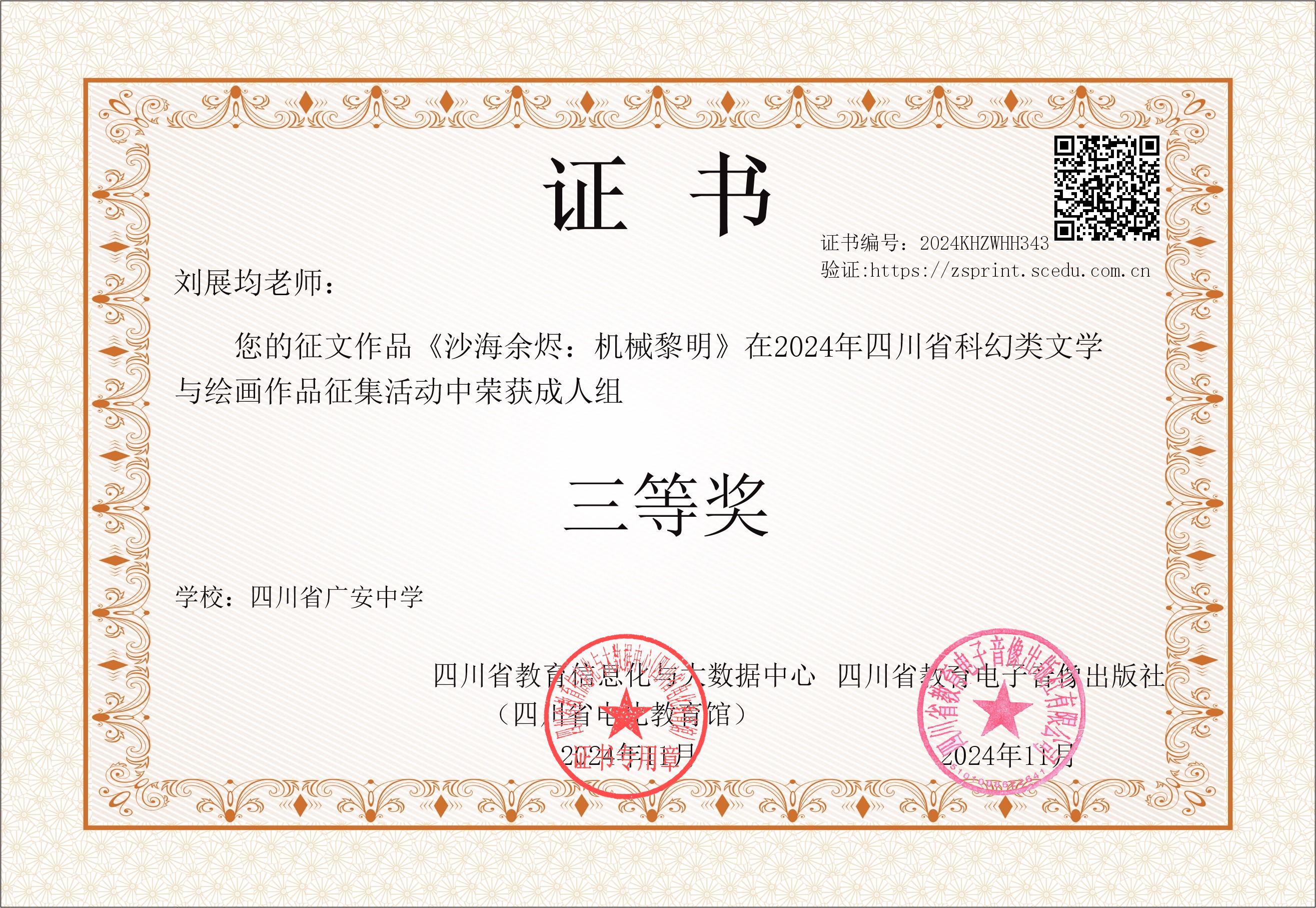 刘展均老师的作品《沙海余烬:机械黎明》在“2024年四川省科幻类文学与绘画作品征集活动”中获成人组(教师组)省三等奖。四川省教育信息化与大数据中心对学校推荐和个人投稿的2069篇征文作品及4473幅绘画作品进行严格评审,并公示无异议。本次活动评选出征文作品一等奖50篇、二等奖100篇、三等奖200篇,绘画作品一等奖10幅、二等奖20幅、三等奖40幅,优秀组织单位59个。