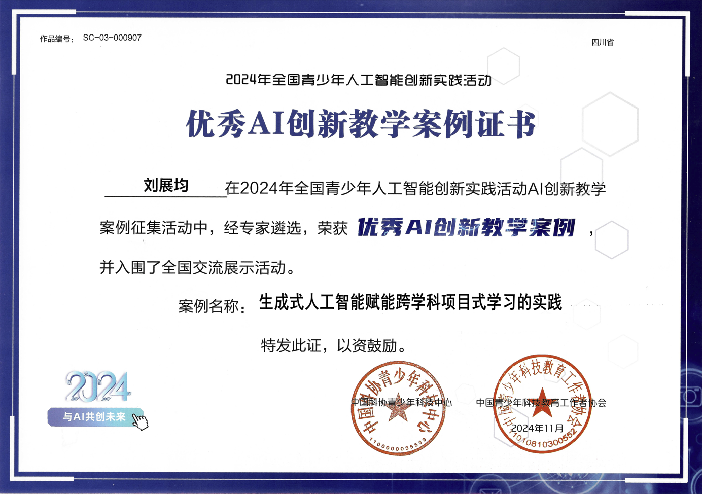 刘展均老师出席了2024年11月24日在南京举办的“全国青少年人工智能创新实践交流展示活动”。他的案例《生成式人工智能赋能跨学科项目式学习的实践》荣获“优秀AI创新教学案例”称号,并在活动上进行了展示和交流。刘老师代表四川省参加了此次活动,并在四川省代表队的合影中留下了纪念。