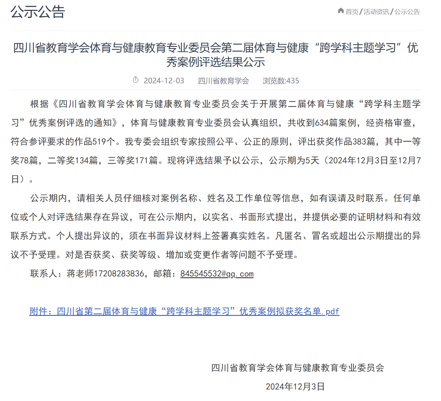 四川省教育学会体育与健康教育专业委员会第二届体育与健康“跨学科主题学习”优秀案例评选结果公示:https://www.scsjyxh.com/article/13_1351_0_1876992.html